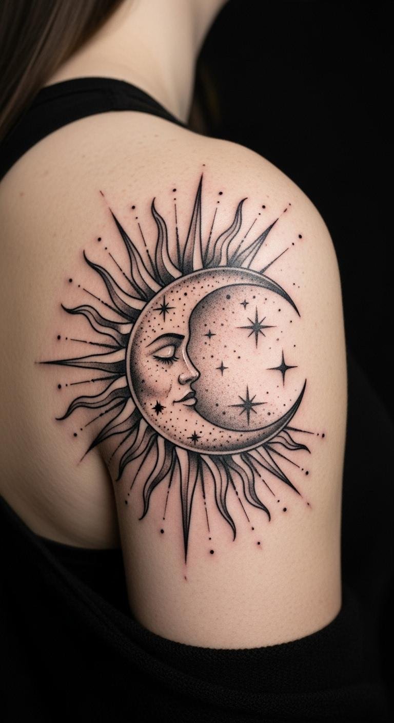 This tattoo symbolizes a deep connection to the universe, representing the balance of light and dark alongside the cyclical nature of life.