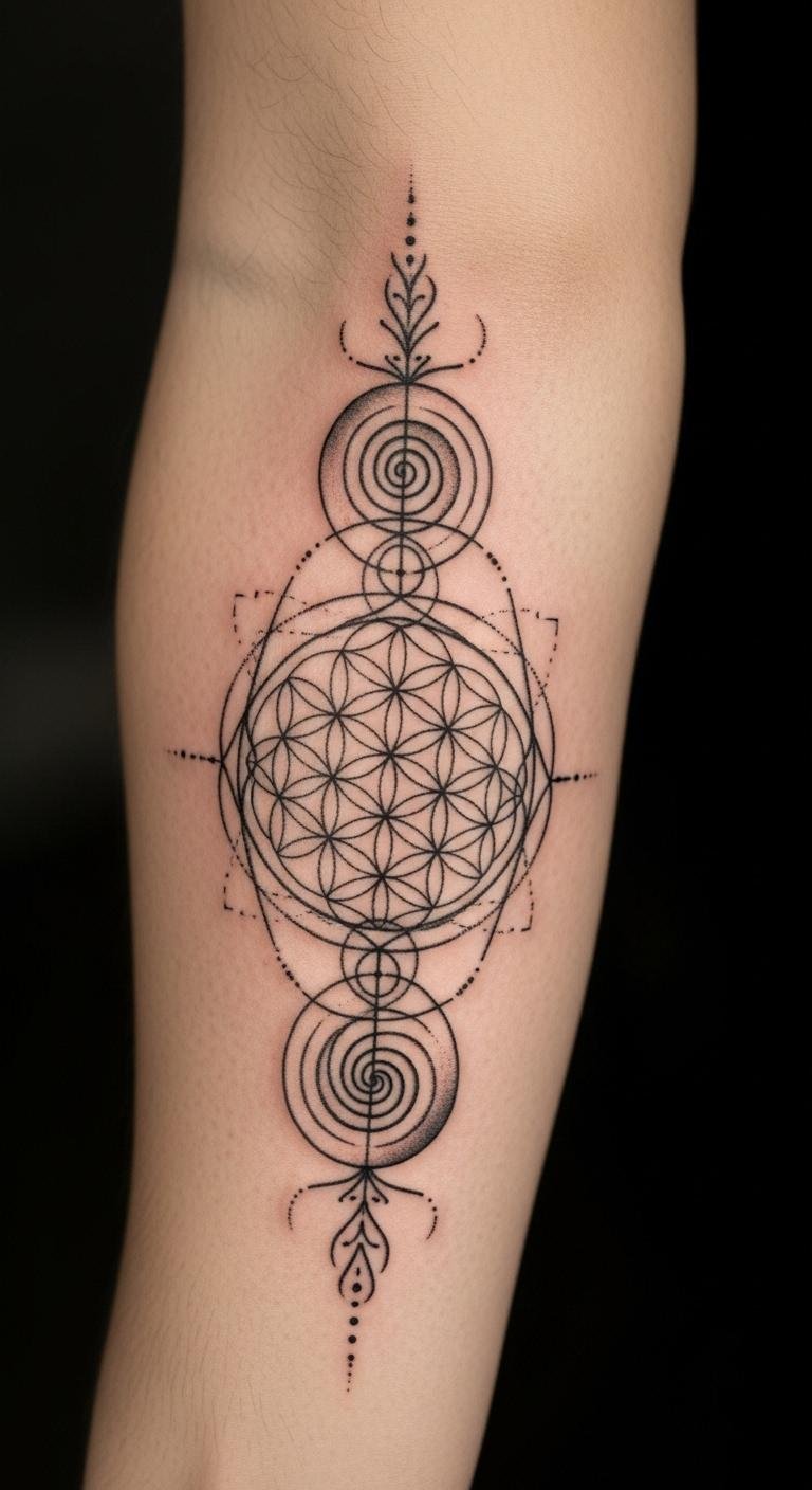 Placed on the forearm, it becomes a visible reminder of freedom and enlightenment, inviting others to appreciate the beauty of the sacred geometry.