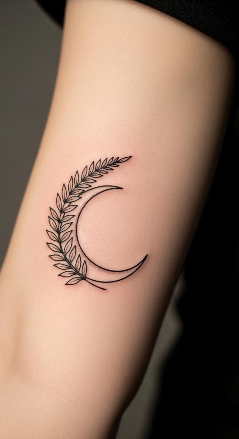 This tattoo symbolizes the connection between nature and spirituality, with the crescent moon representing intuition and the cycles of life, while the fern leaf signifies growth and resilience.