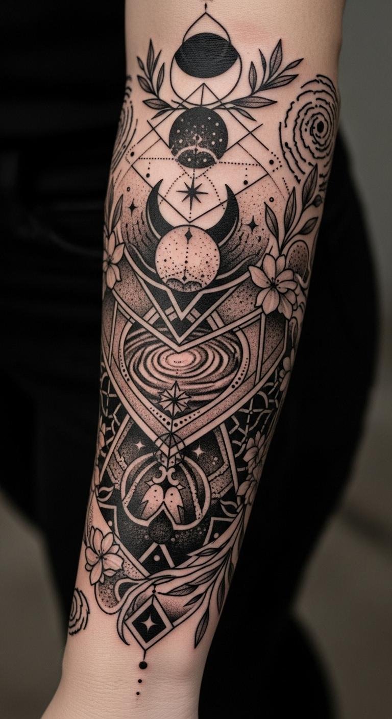 This forearm tattoo symbolizes the connection between the individual and the universe, embodying a journey of self-discovery and spiritual growth.