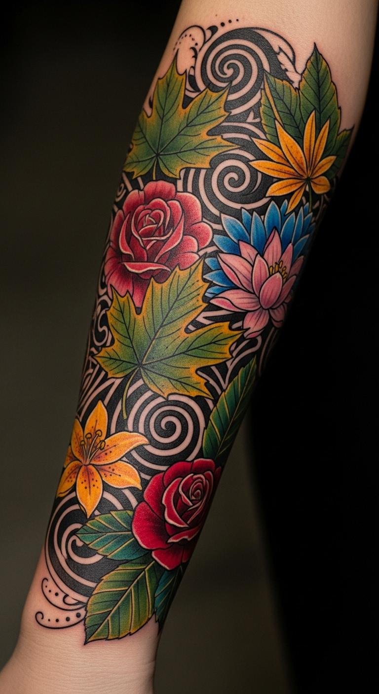 This tattoo embodies the colorful symbolism of vibrant designs that reflect individuality and a deep connection to the earth.