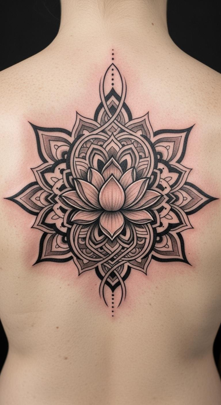 This tattoo symbolizes the journey of spiritual growth and resilience. The mandala represents the universe and the interconnectedness of all things, while the lotus flower signifies rising above challenges and achieving enlightenment.
