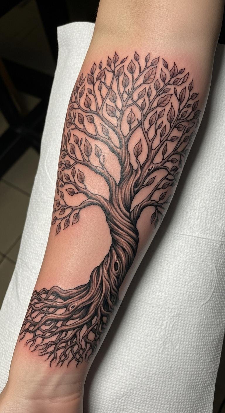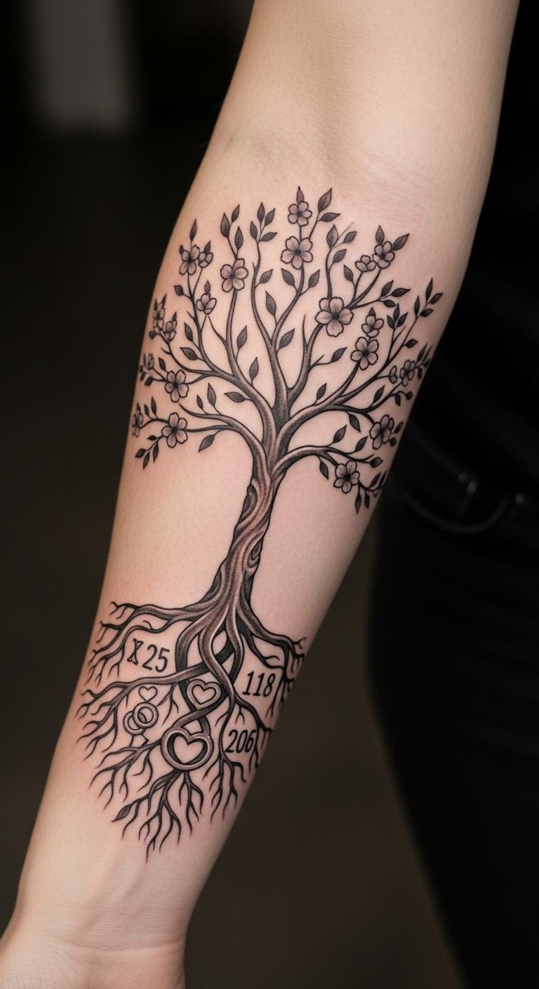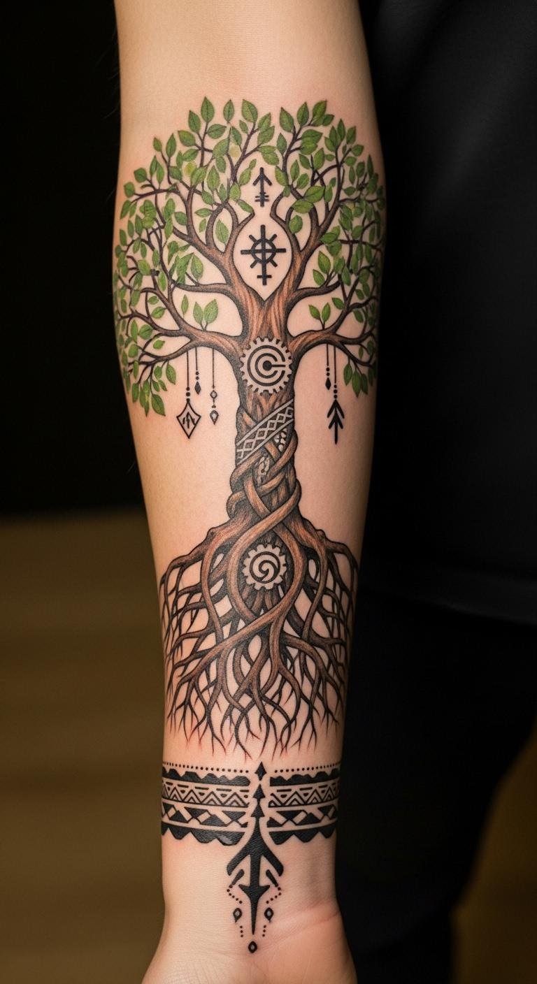 This tattoo embodies the essence of ancestral heritage, with the tree representing strength, growth, and the deep roots of family history.