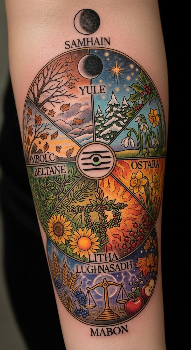 This tattoo, placed prominently on the forearm, serves as a constant reminder of the sacred cycle of nature. Each segment reflects the beauty of the seasons, allowing the wearer to connect deeply with the rhythms of life.