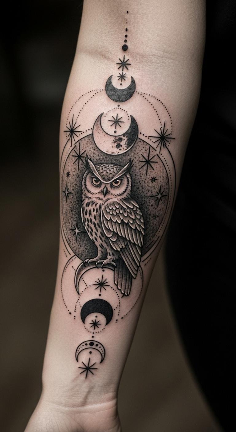 This tattoo serves as a visual representation of the wearer’s spiritual journey, connecting them to the universe’s rhythms and deeper meanings.