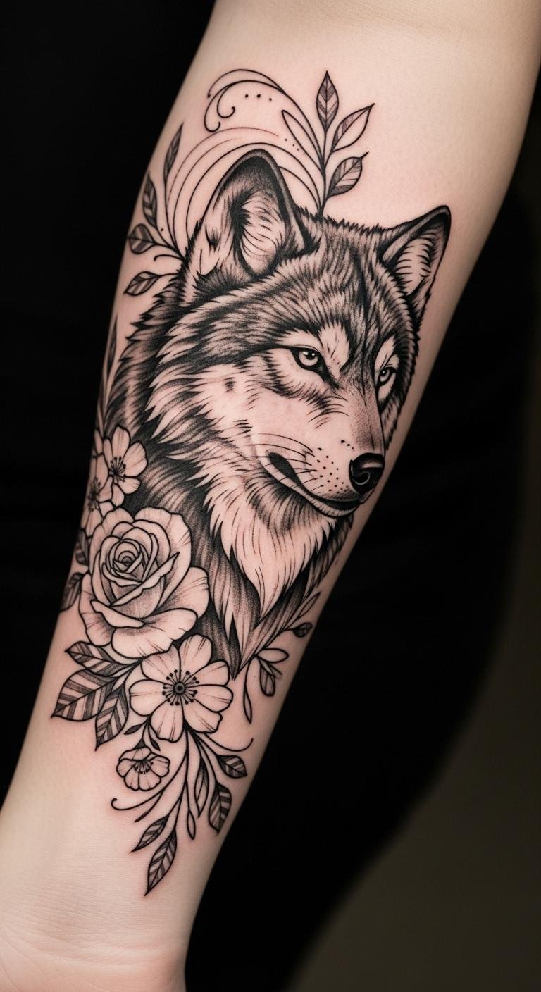 The floral elements add a touch of softness and beauty, representing growth and transformation. Positioned on the forearm, it serves as a constant reminder of the wearer’s inner power and authenticity, allowing them to express their true self while embracing both the ferocity and grace of their spirit animal.