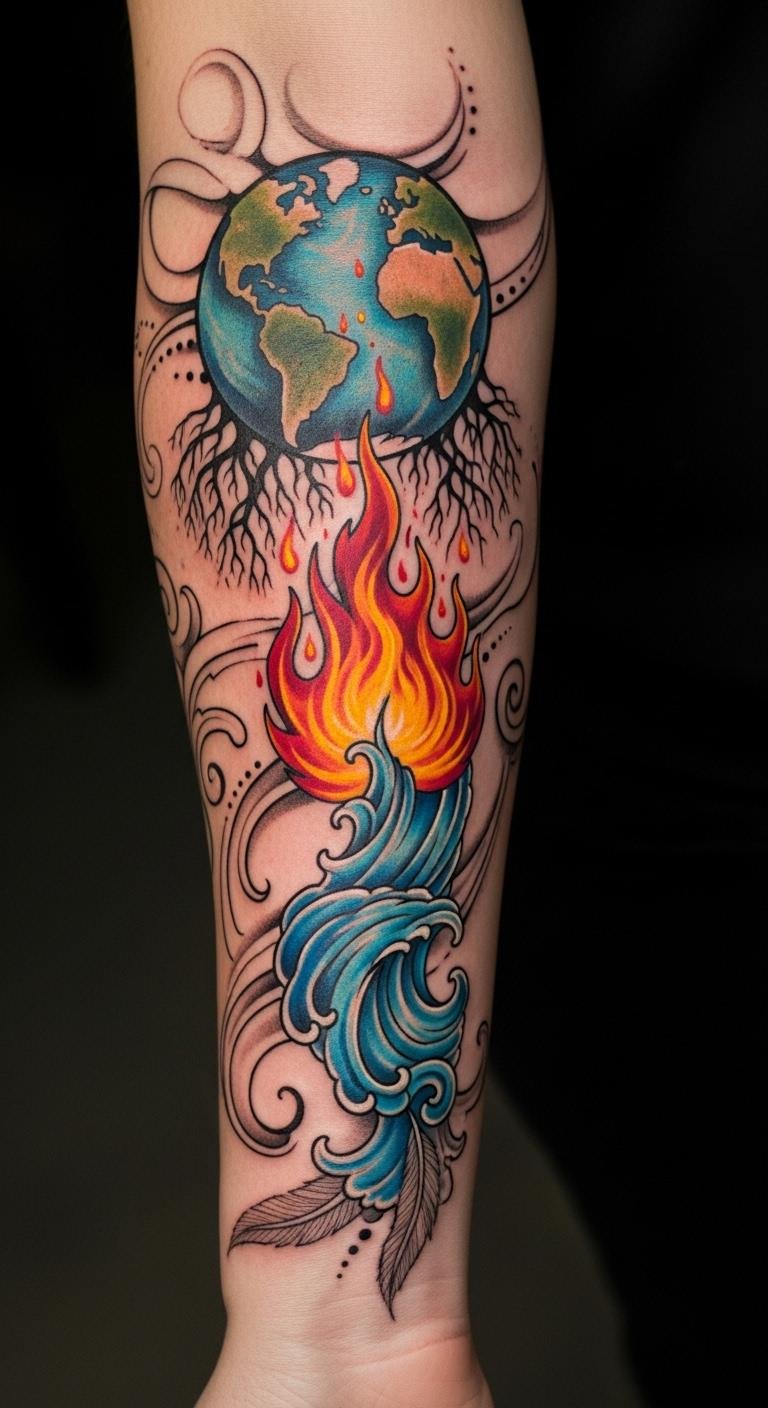 Positioned on the forearm, this design allows for visibility and personal expression, serving as a constant reminder of the grounding energy of earth, the fervor of fire, the depth of water, and the liberating spirit of air.