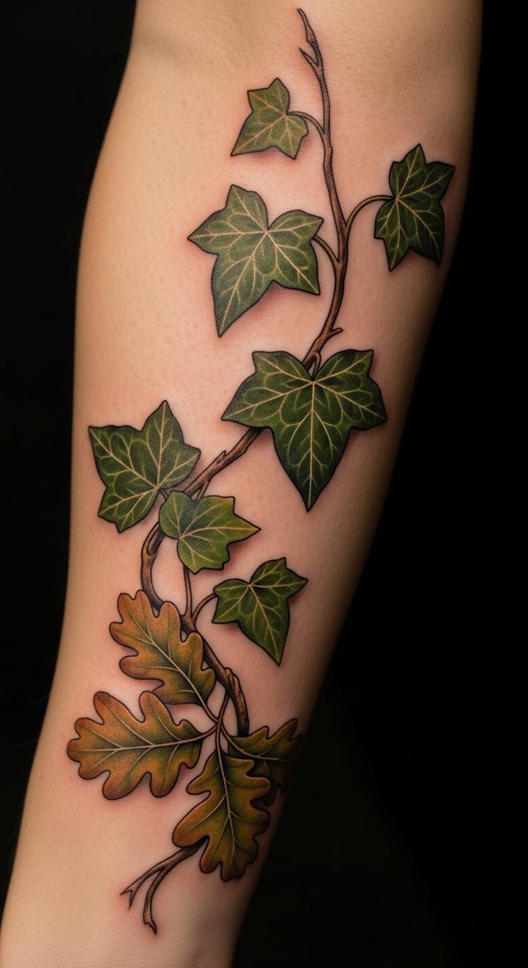 Ivy and oak represent resilience and strength, making this tattoo a powerful emblem of personal growth and connection to nature.