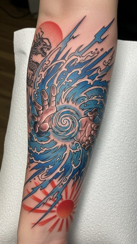 This tattoo symbolizes the dynamic energy and passion found in Dragon Ball Z’s epic battles, representing strength, perseverance, and the spirit of competition.