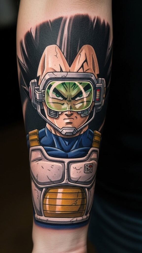 The tattoo symbolizes fierce determination and warrior pride, representing Vegeta’s resilience and strength as a Saiyan.