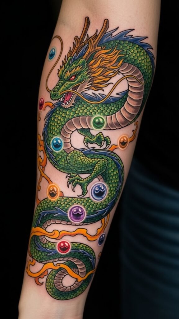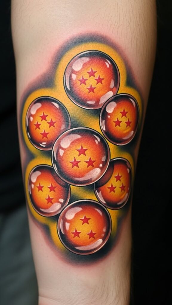 Placing it on the forearm ensures that it’s easily visible, serving as a daily reminder of one’s goals and aspirations. The Dragon Balls represent the pursuit of dreams, each one holding personal significance, while the energy lines signify the power and determination needed to achieve them.