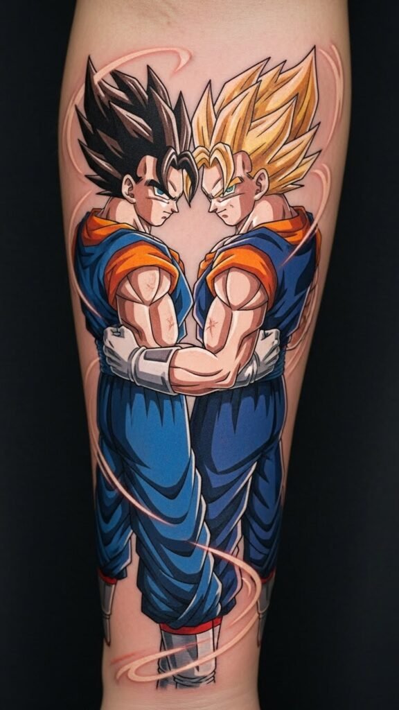 This tattoo symbolizes the extraordinary bond of strength and synergy that Vegito and Gogeta represent in the Dragon Ball Z universe.