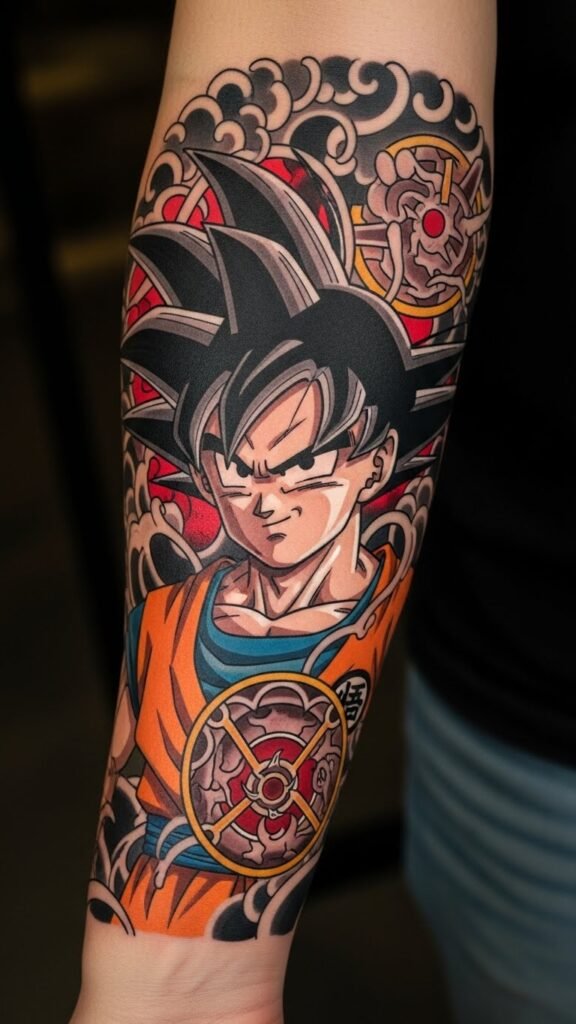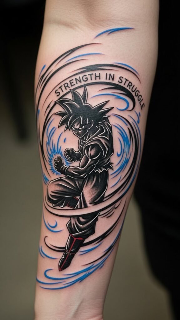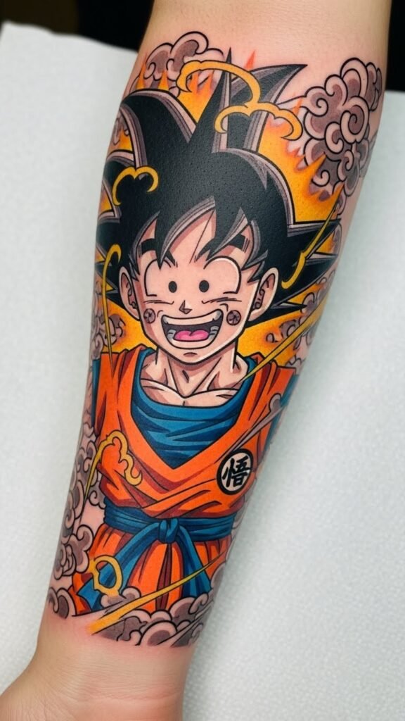 This tattoo signifies the relentless pursuit of strength and personal growth, mirroring Goku’s journey in Dragon Ball Z.