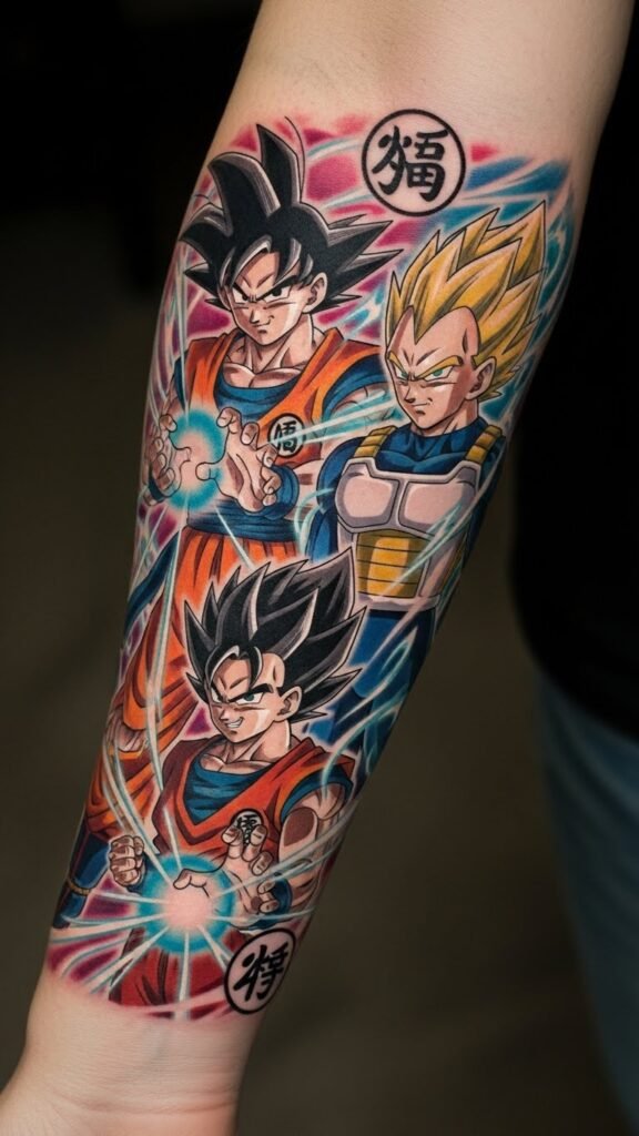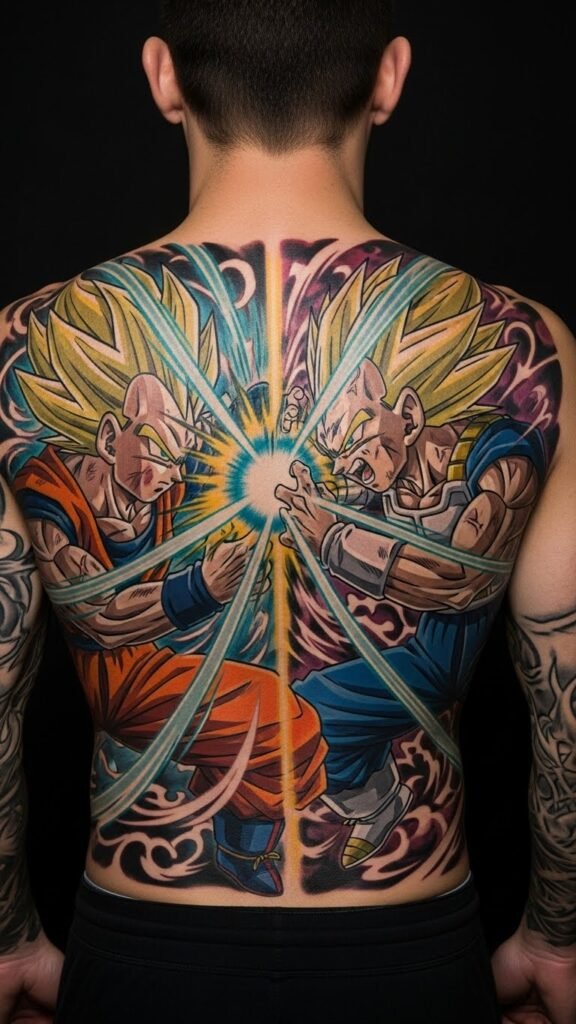 This tattoo serves as a powerful expression of passion for Dragon Ball Z, symbolizing the fierce rivalry and camaraderie between Goku and Vegeta.