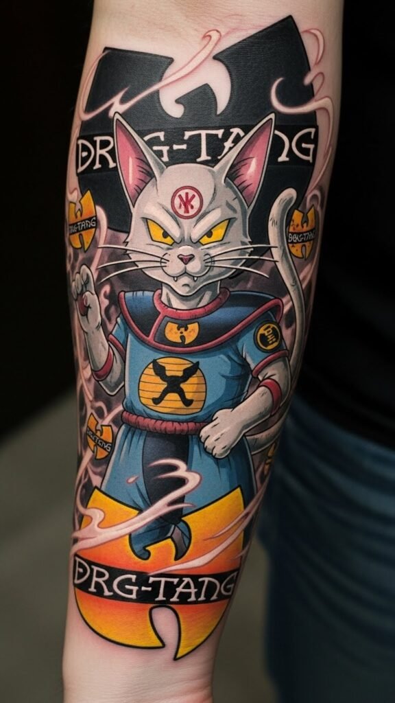 This tattoo concept embodies a powerful blend of martial arts mastery and hip-hop energy, symbolizing the wisdom of Korin alongside the rebellious spirit of Wu-Tang.