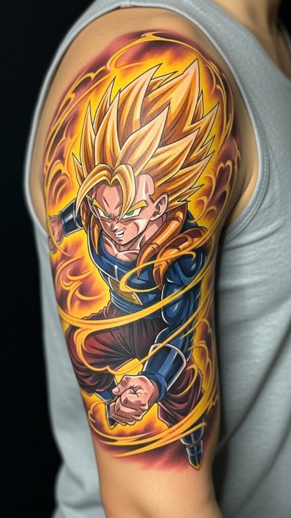 This tattoo symbolizes Goku’s relentless spirit and mastery of martial arts, embodying the idea of harnessing one’s inner strength.
