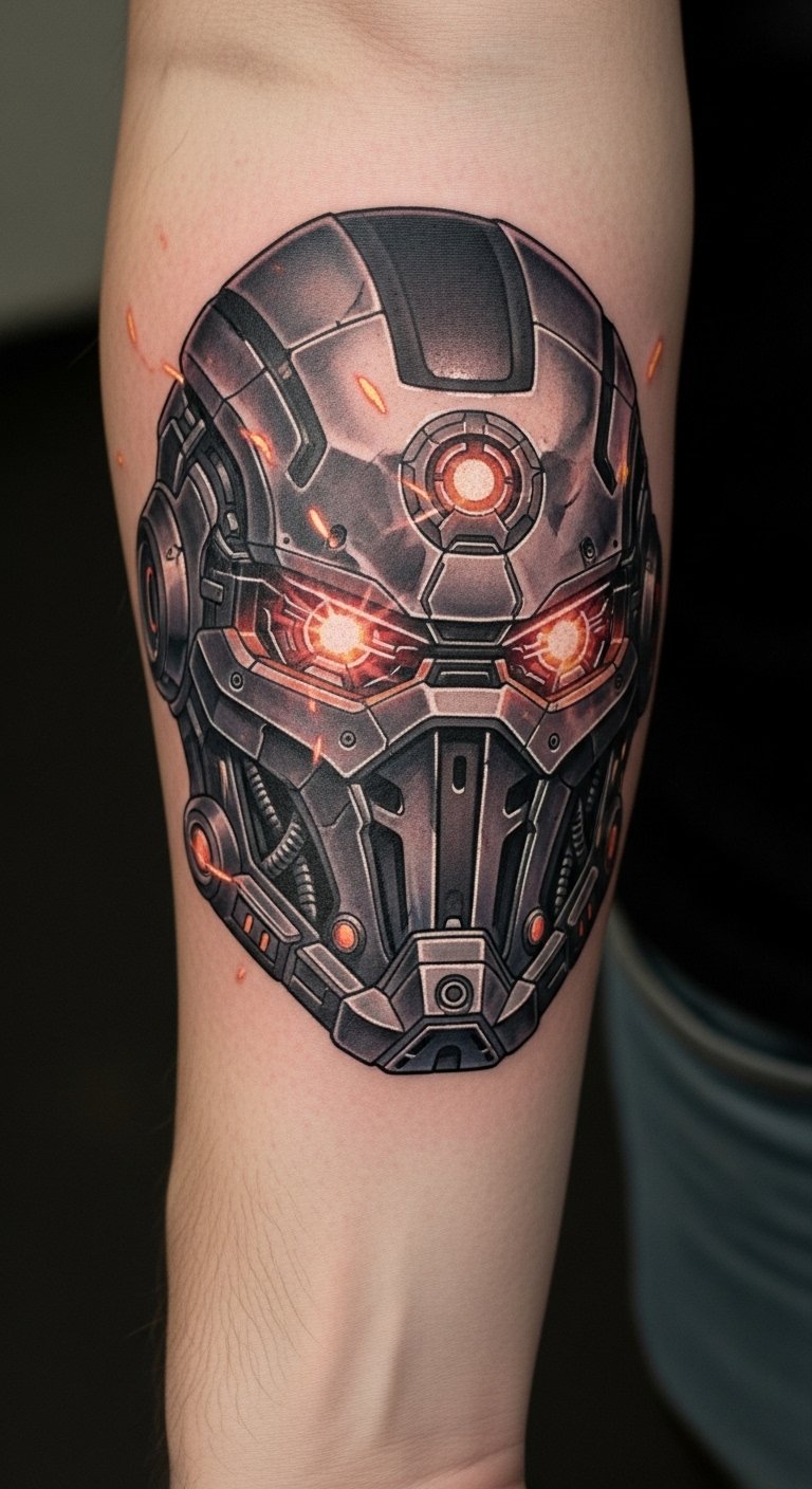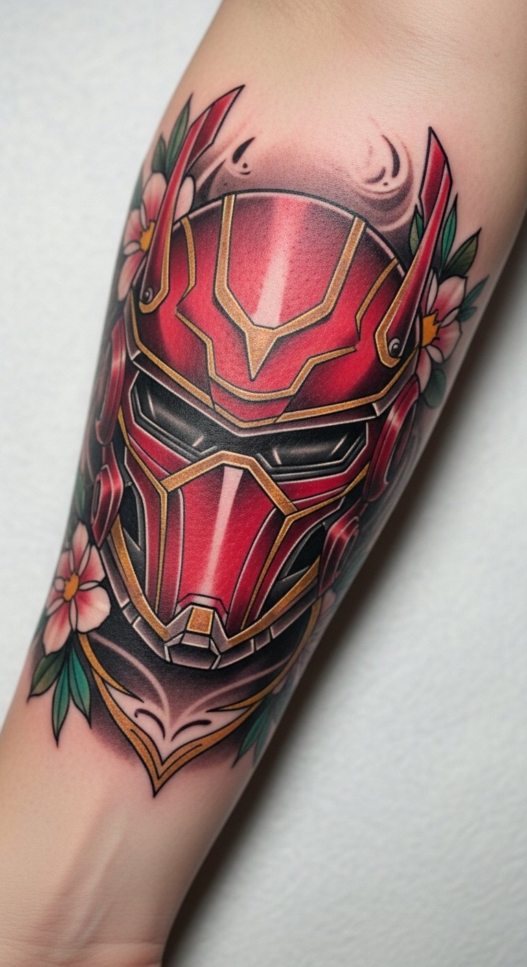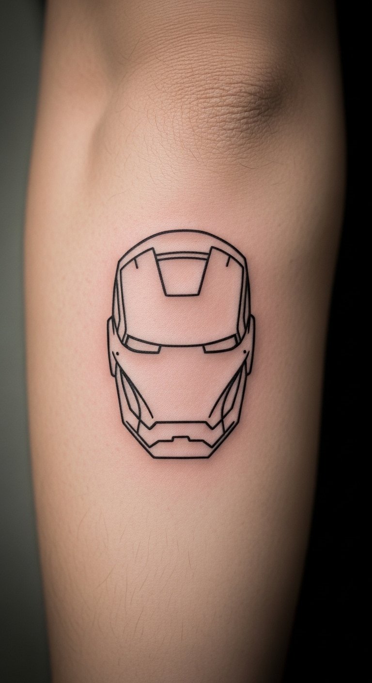 This Iron Man helmet tattoo symbolizes bravery and innovation, embodying the spirit of a hero who faces challenges head-on.