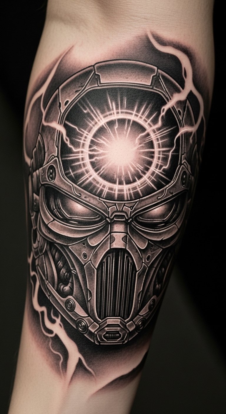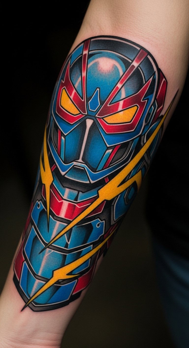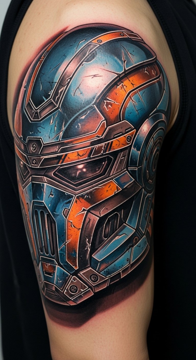 This Iron Man helmet tattoo symbolizes bravery and innovation, embodying the spirit of a hero who faces challenges head-on.