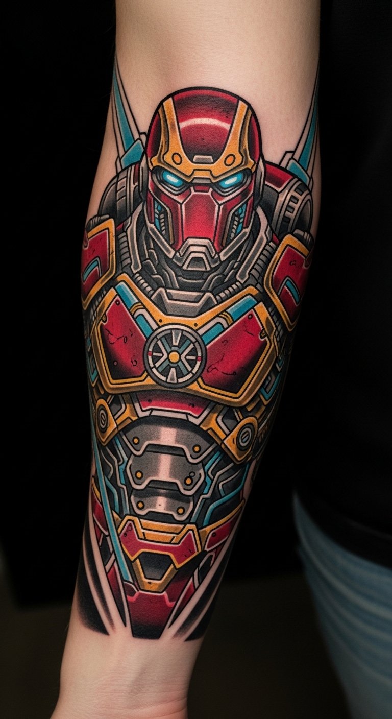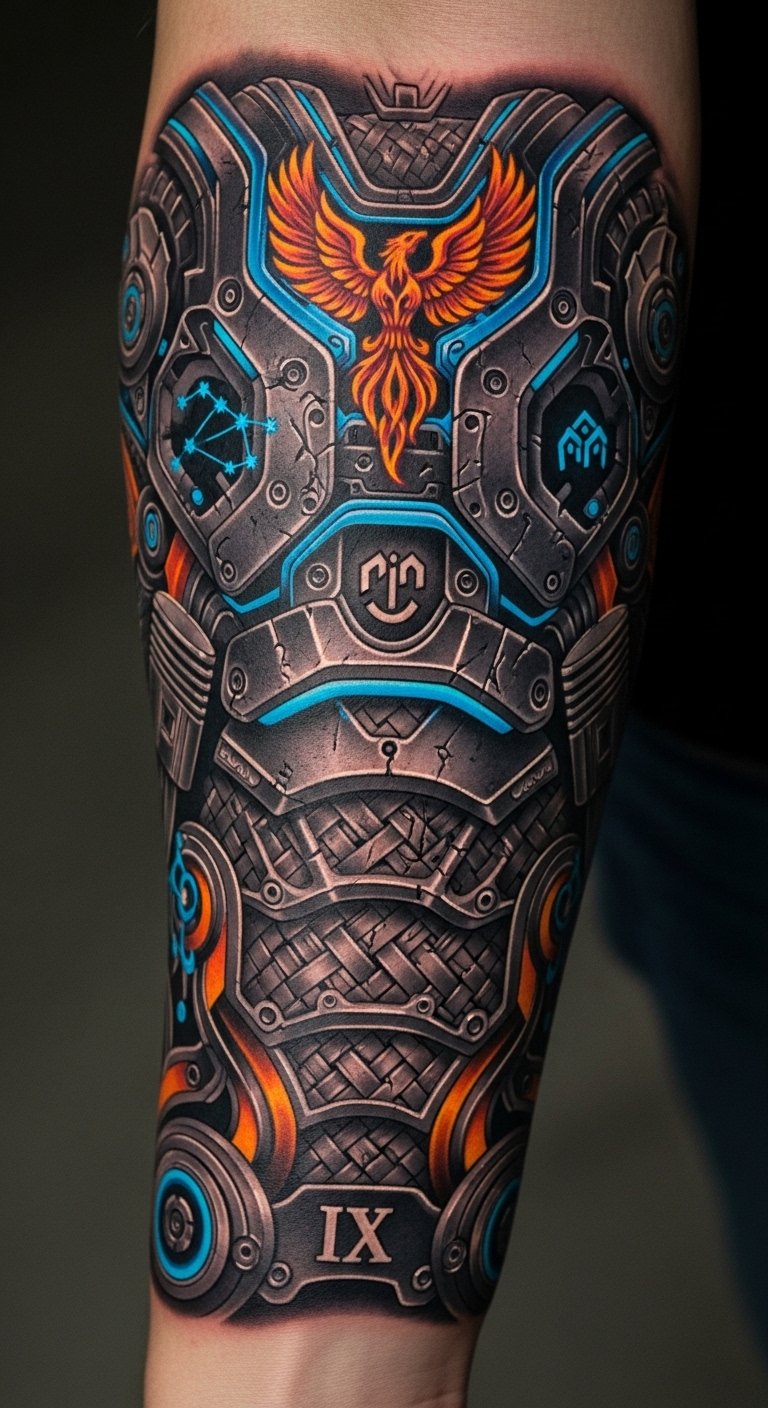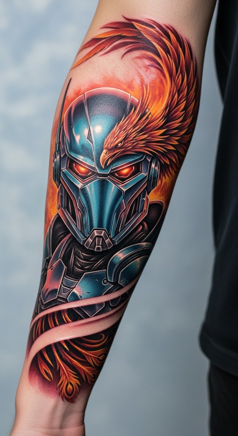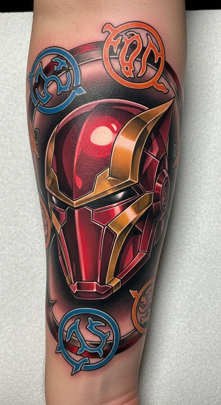 The tattoo embodies resilience and transformation, emphasizing the journey of growth through adversity. Positioned on the forearm and upper arm, it serves as a constant reminder of strength and determination, while also connecting with the Iron Man fandom. Each detail symbolizes personal evolution and the courage to face challenges, making it a powerful piece of storytelling art that resonates deeply with the wearer’s own experiences.