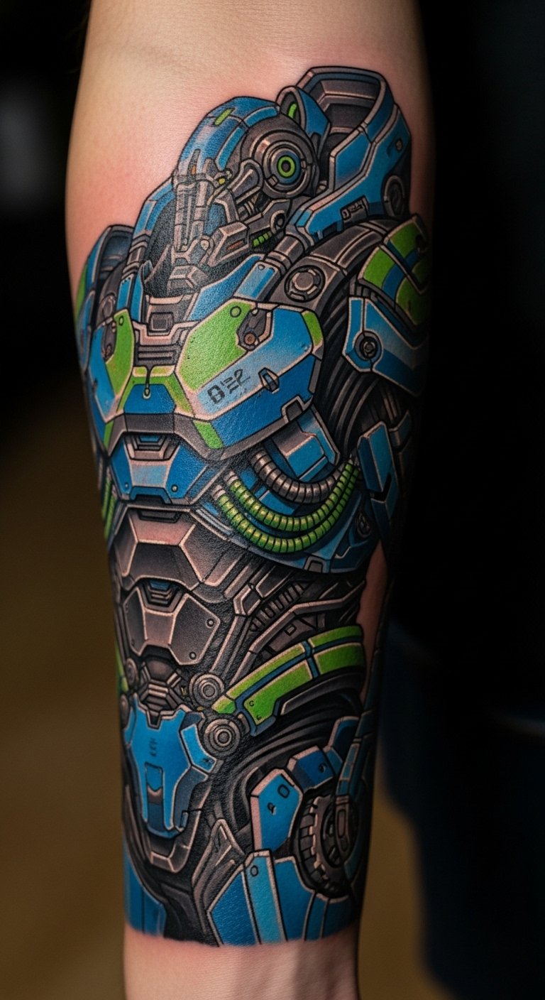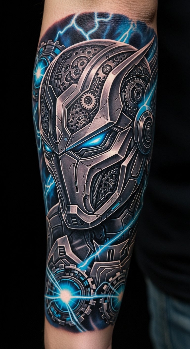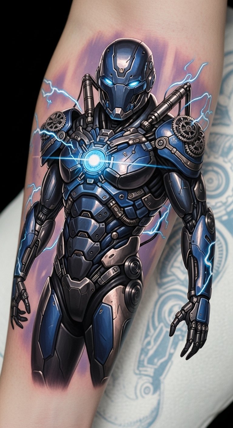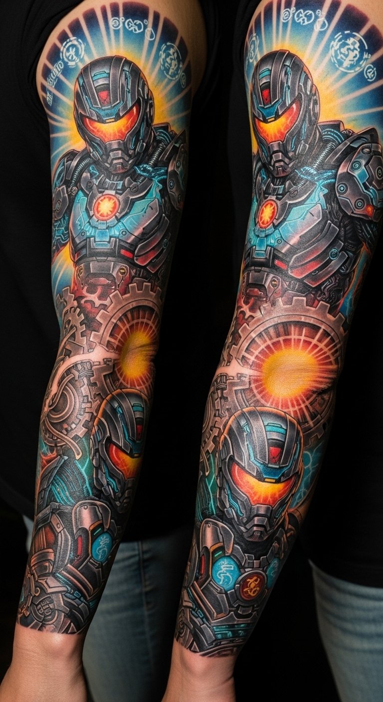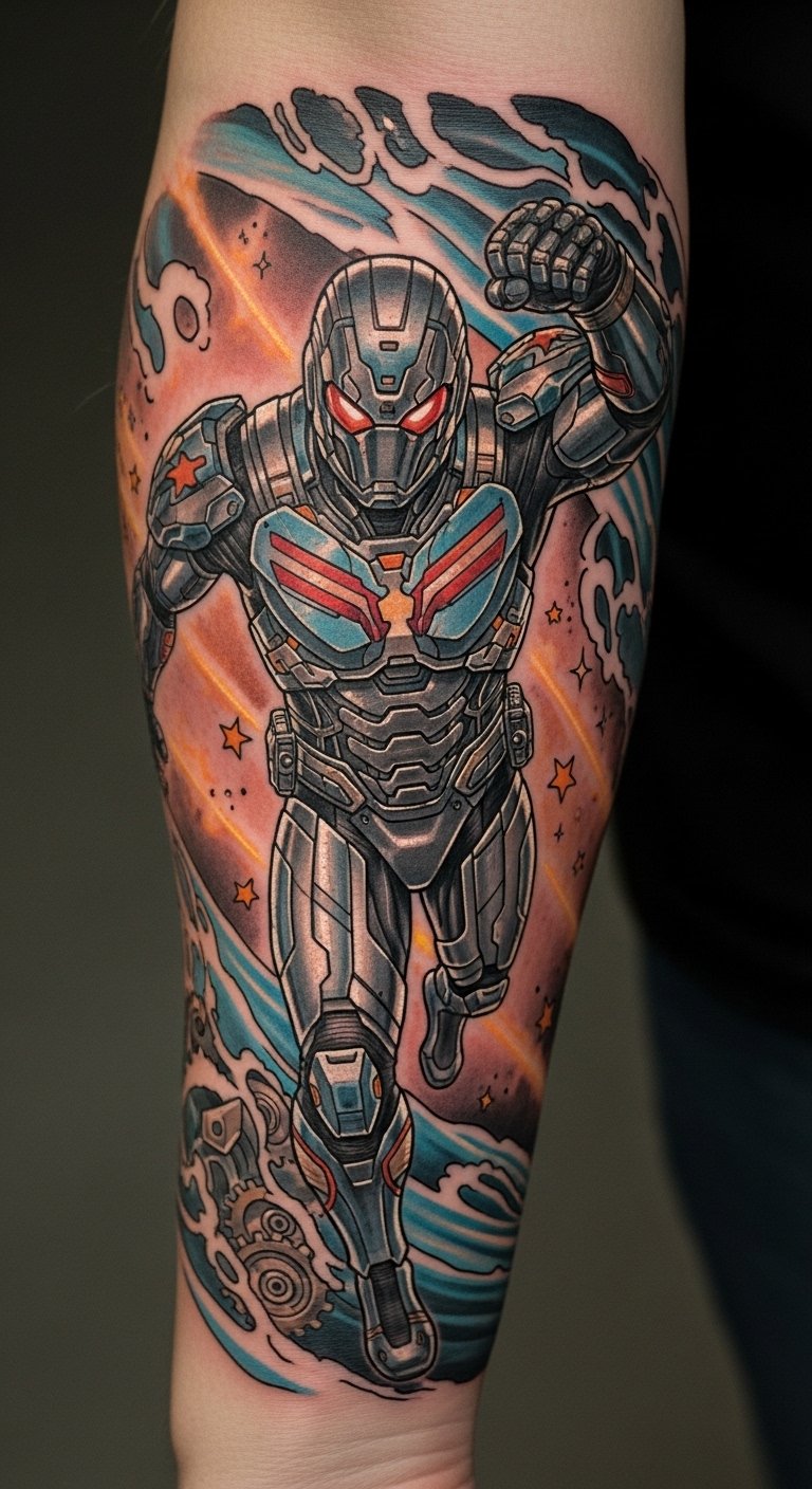 The tattoo embodies resilience and transformation, emphasizing the journey of growth through adversity. Positioned on the forearm and upper arm, it serves as a constant reminder of strength and determination, while also connecting with the Iron Man fandom. Each detail symbolizes personal evolution and the courage to face challenges, making it a powerful piece of storytelling art that resonates deeply with the wearer’s own experiences.