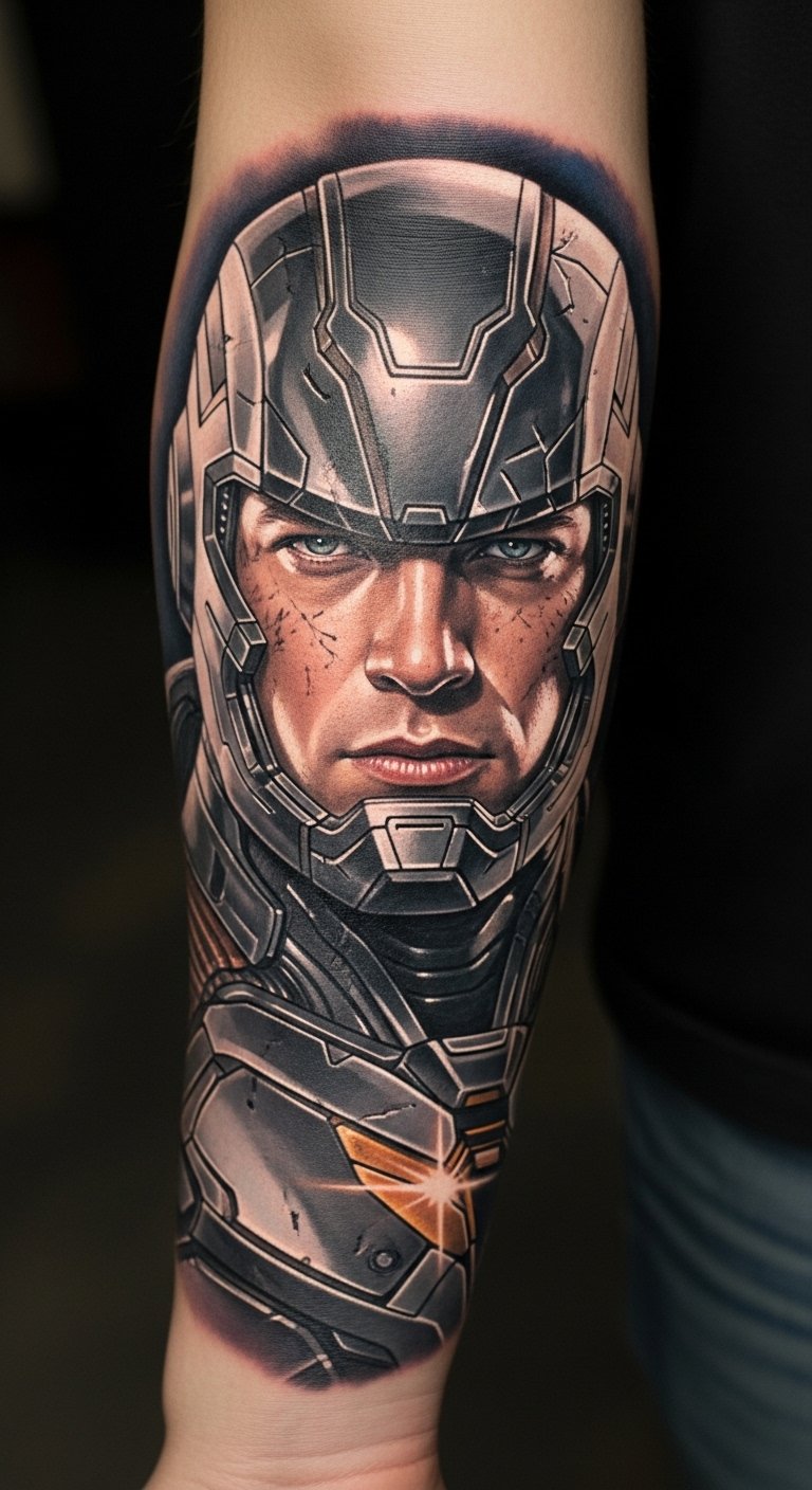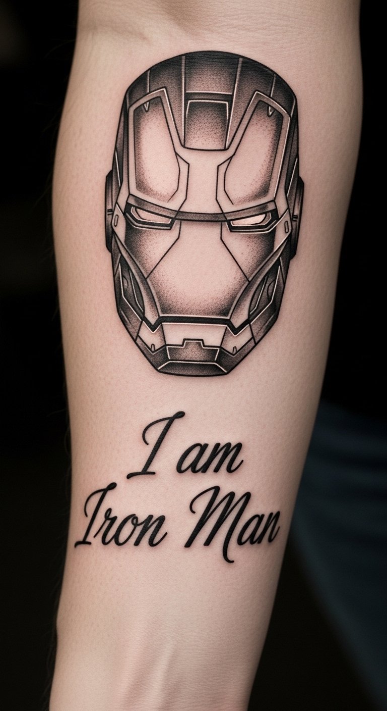 The Iron Man tattoo on the forearm symbolizes bravery and resilience, embodying the spirit of Tony Stark as a hero.