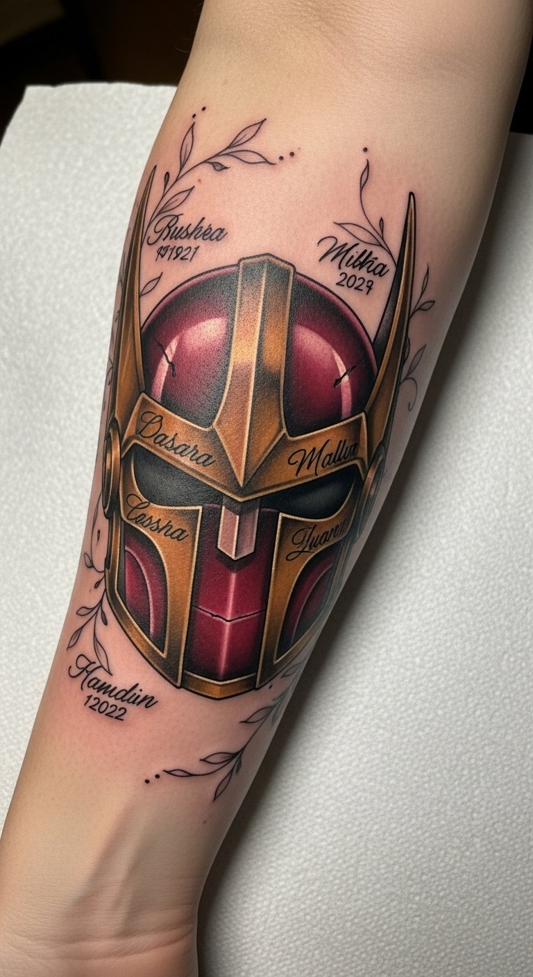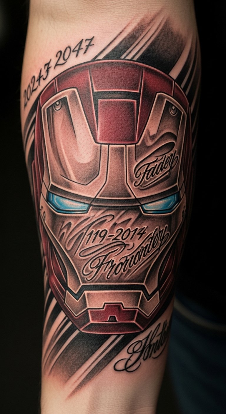 In this tattoo design, Iron Man’s helmet symbolizes resilience and courage, while the personal elements—like the date representing a pivotal moment in your life and the family name—infuse it with deep emotional resonance.