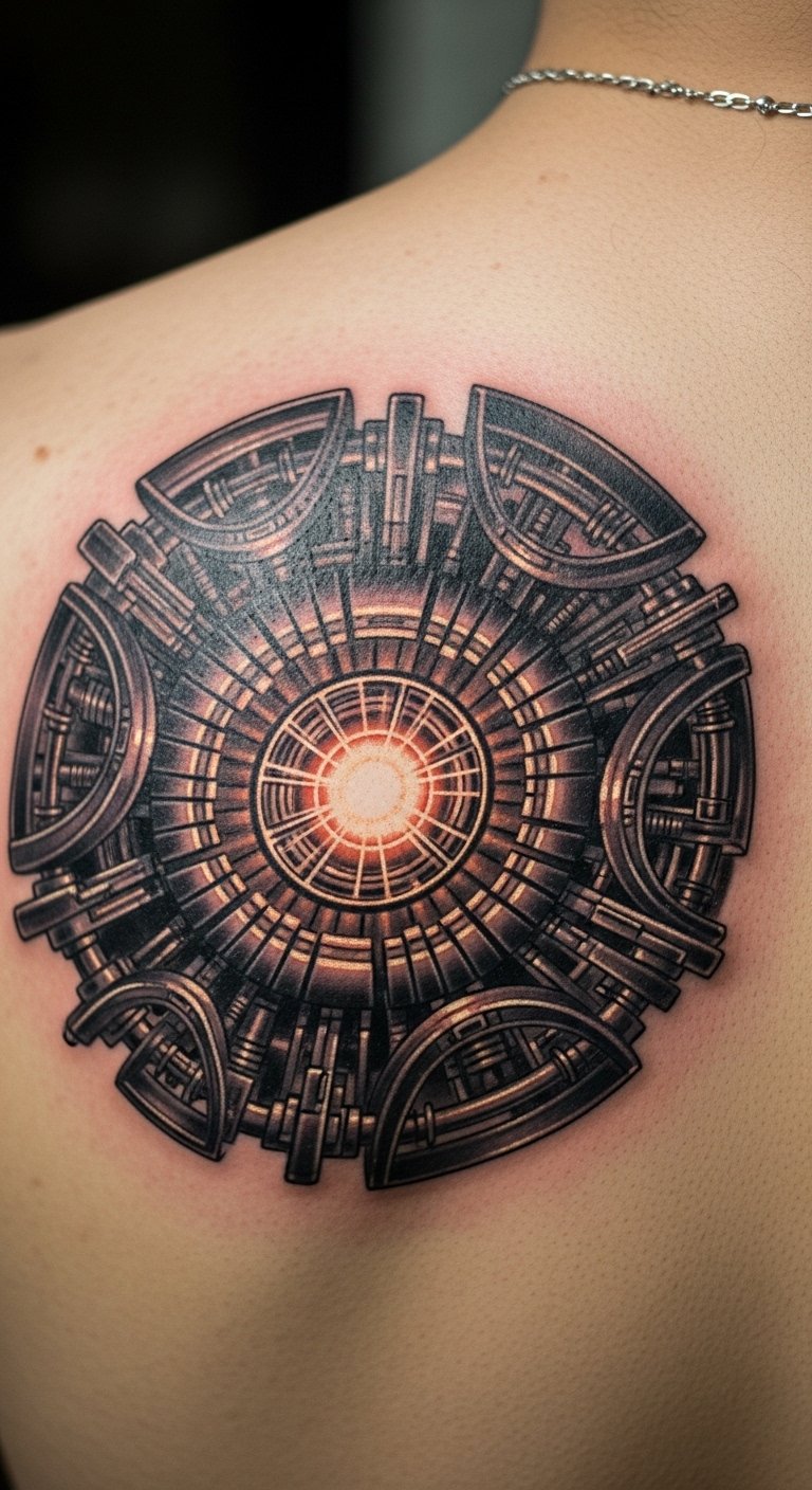 The arc reactor tattoo on the upper back symbolizes transformation and resilience, echoing Tony Stark’s heroic journey.