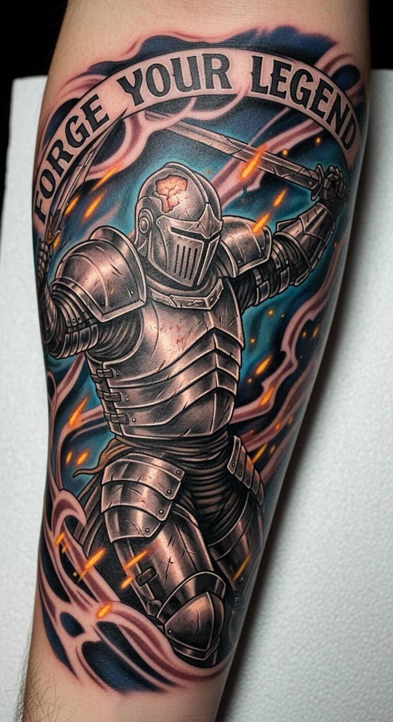 Positioned on the forearm, it serves as a constant reminder of courage and resilience, visible during daily activities, allowing the individual to embrace their hero’s journey and inspire others.