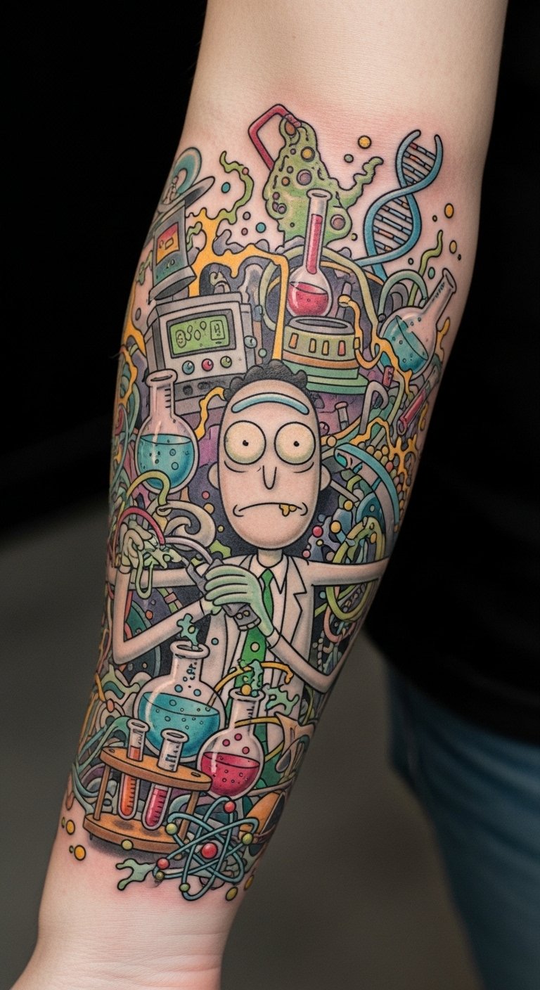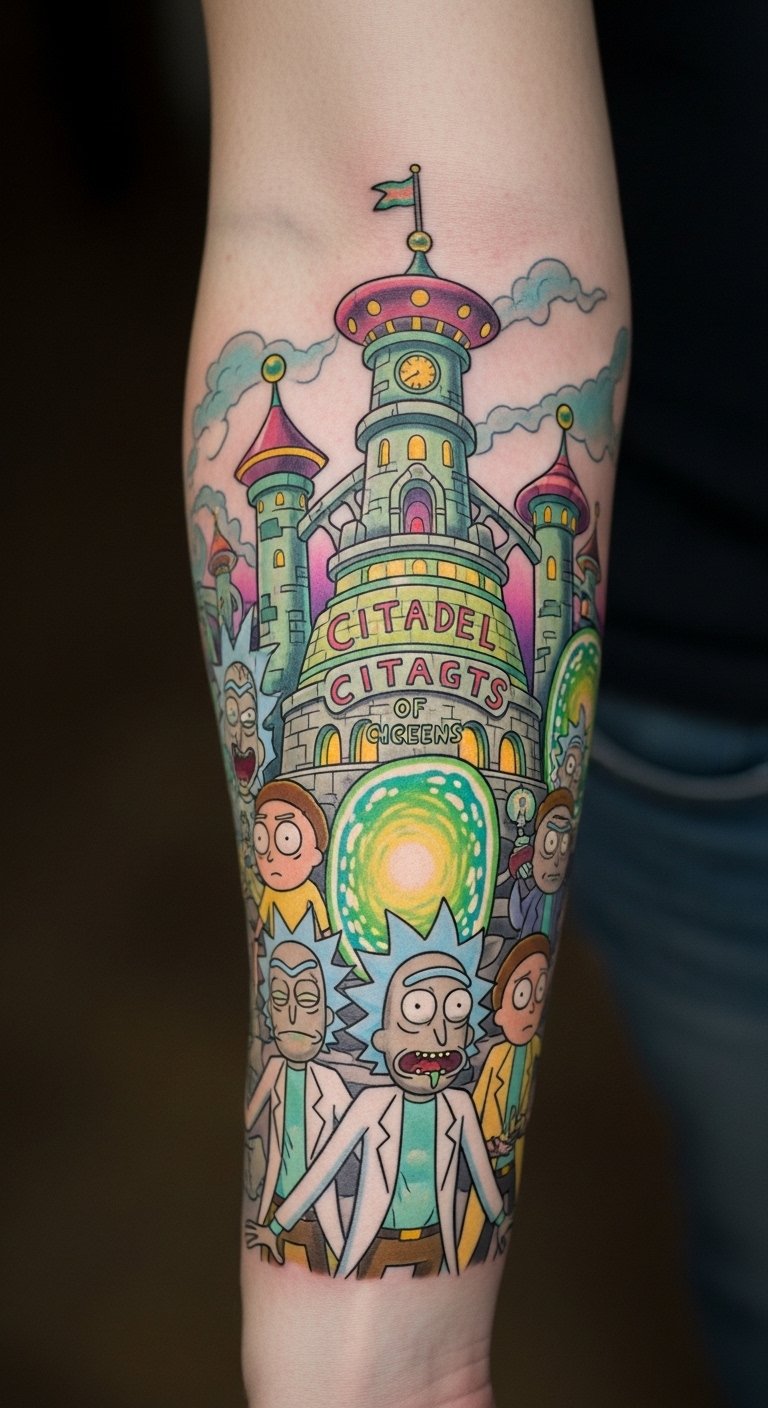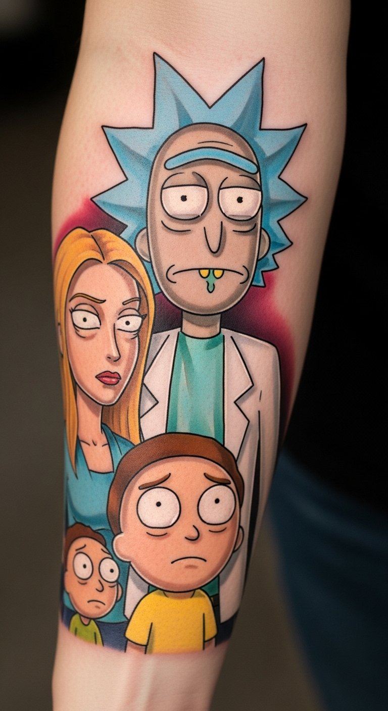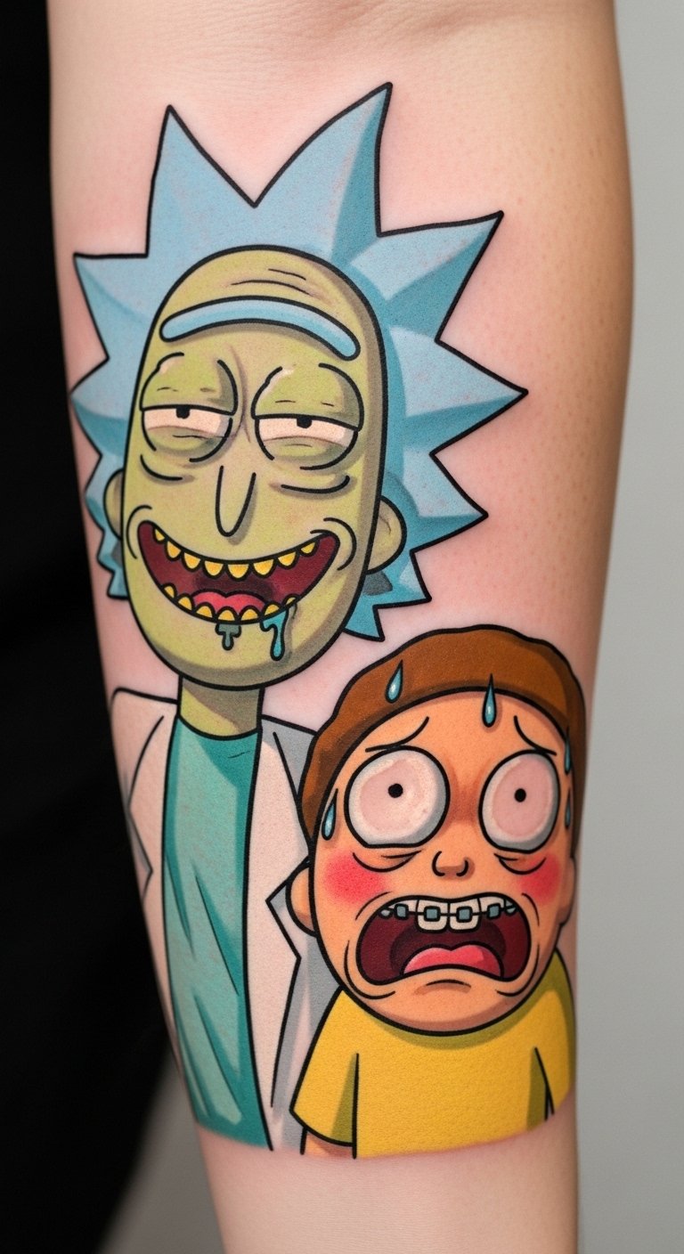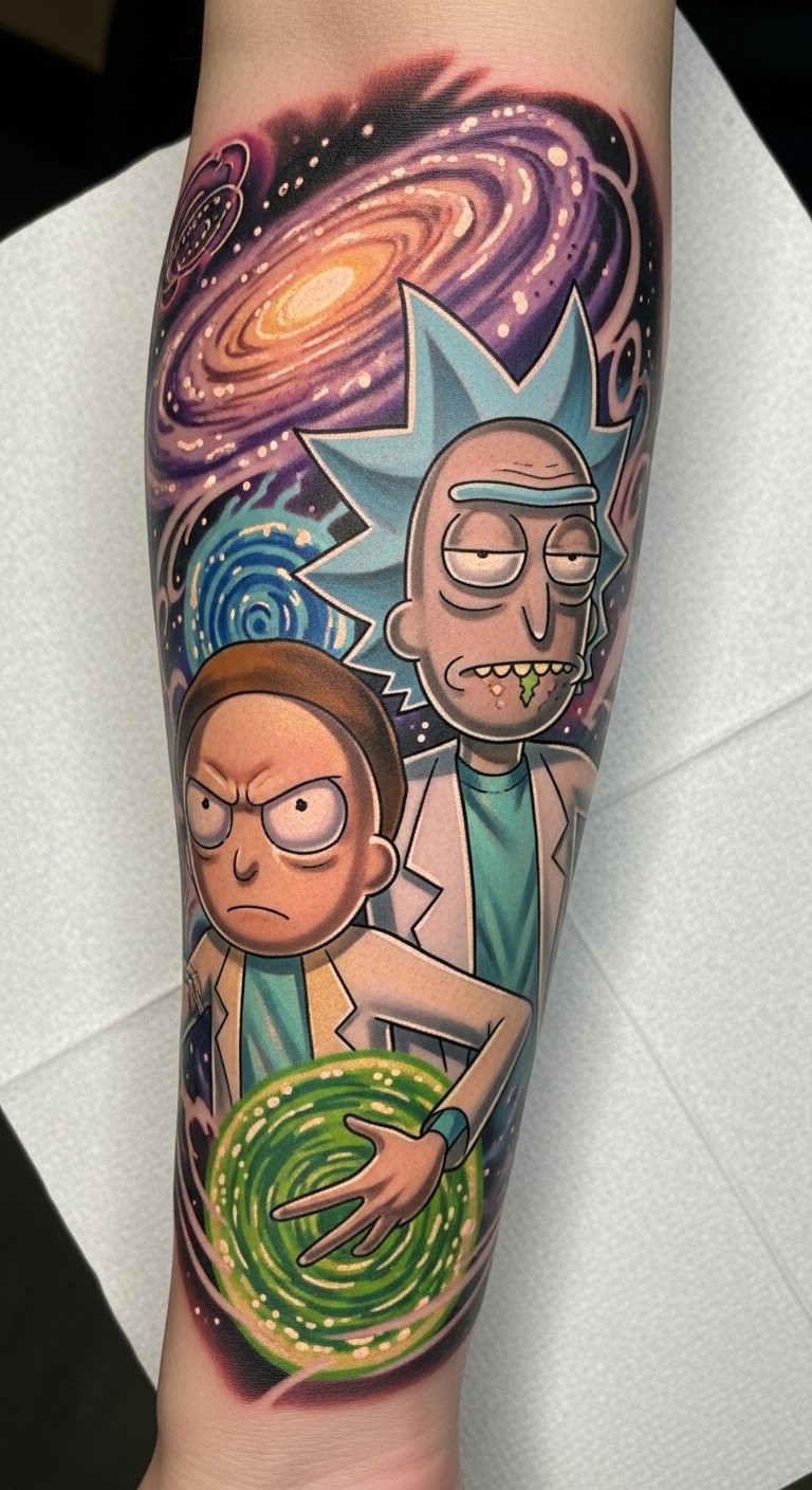 This tattoo design on the forearm symbolizes a deep connection to the beloved series “Rick and Morty,” reflecting the wearer’s playful spirit and love for creative storytelling.