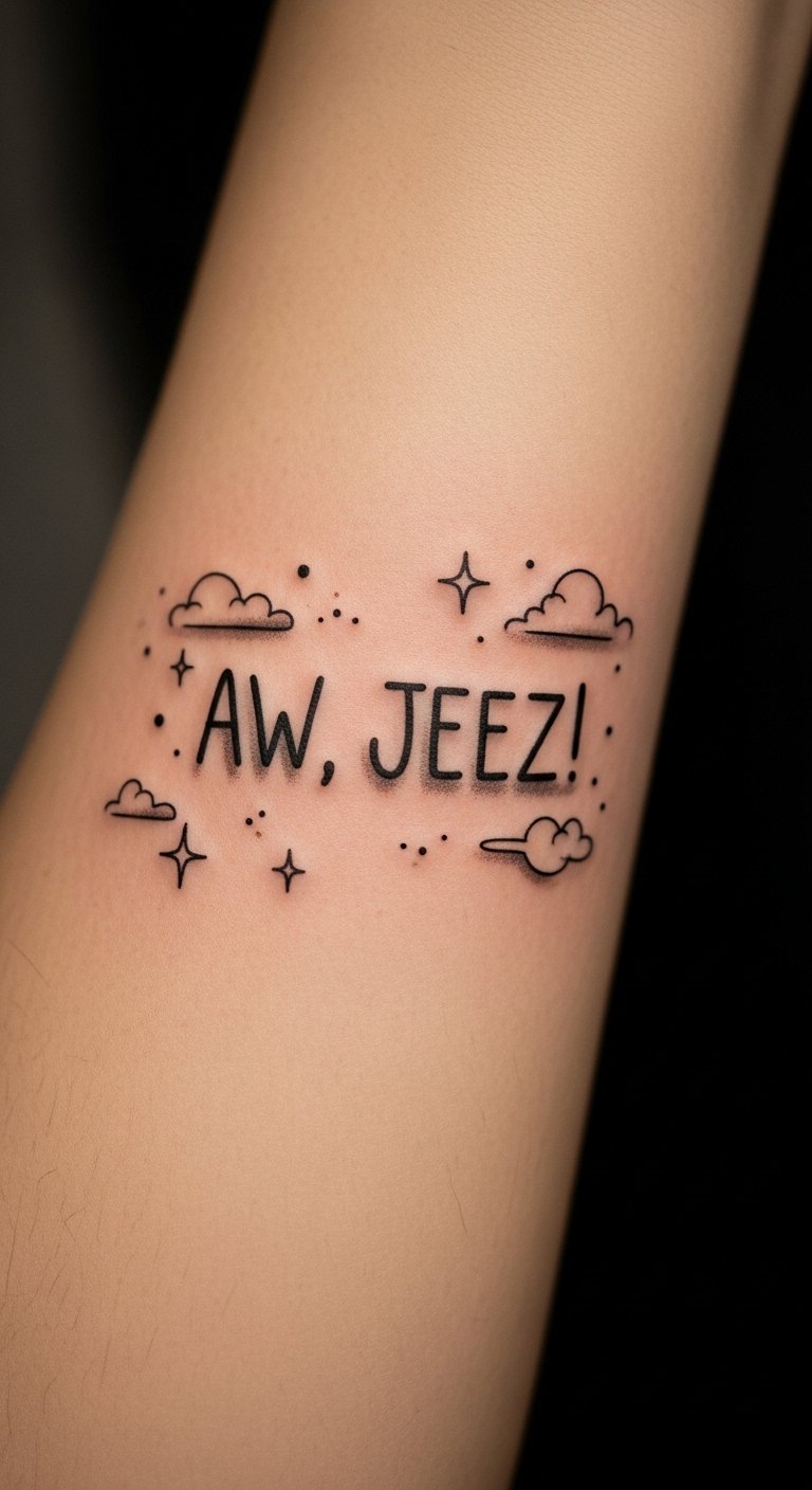 This tattoo design embodies the essence of Morty’s character through its playful font and surrounding doodles. The phrase “Aw, jeez!” encapsulates Morty’s youthful innocence and relatable anxiety, making it a powerful expression of fandom.