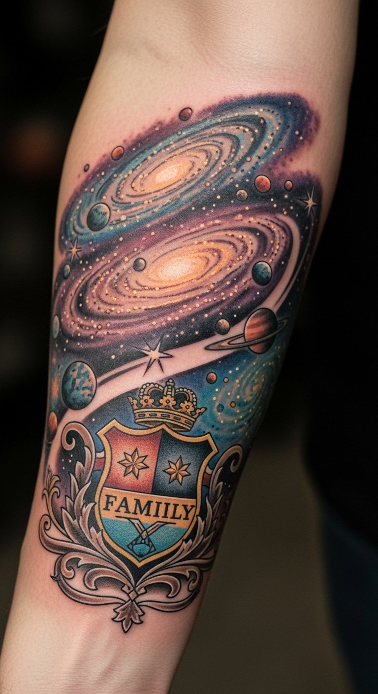 Positioned on the forearm, it serves as a constant reminder of family loyalty and the limitless possibilities that lie ahead.