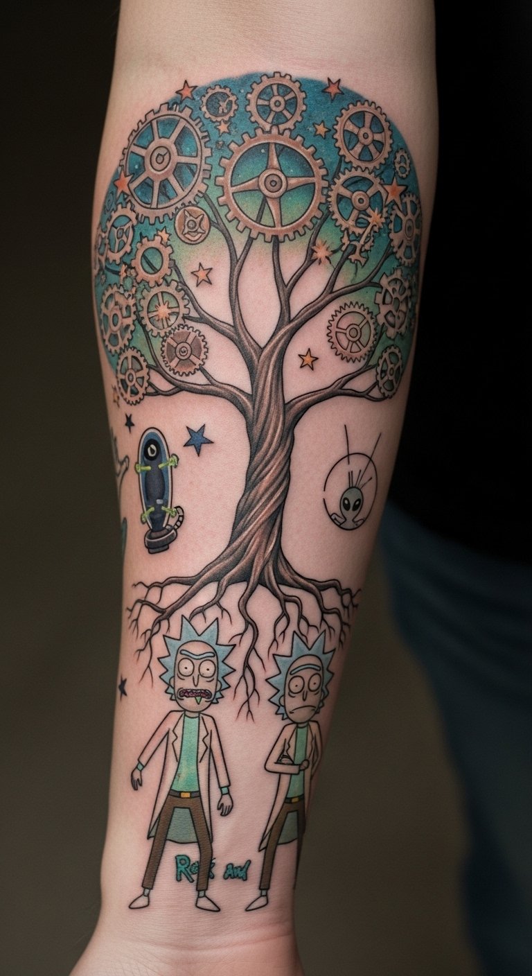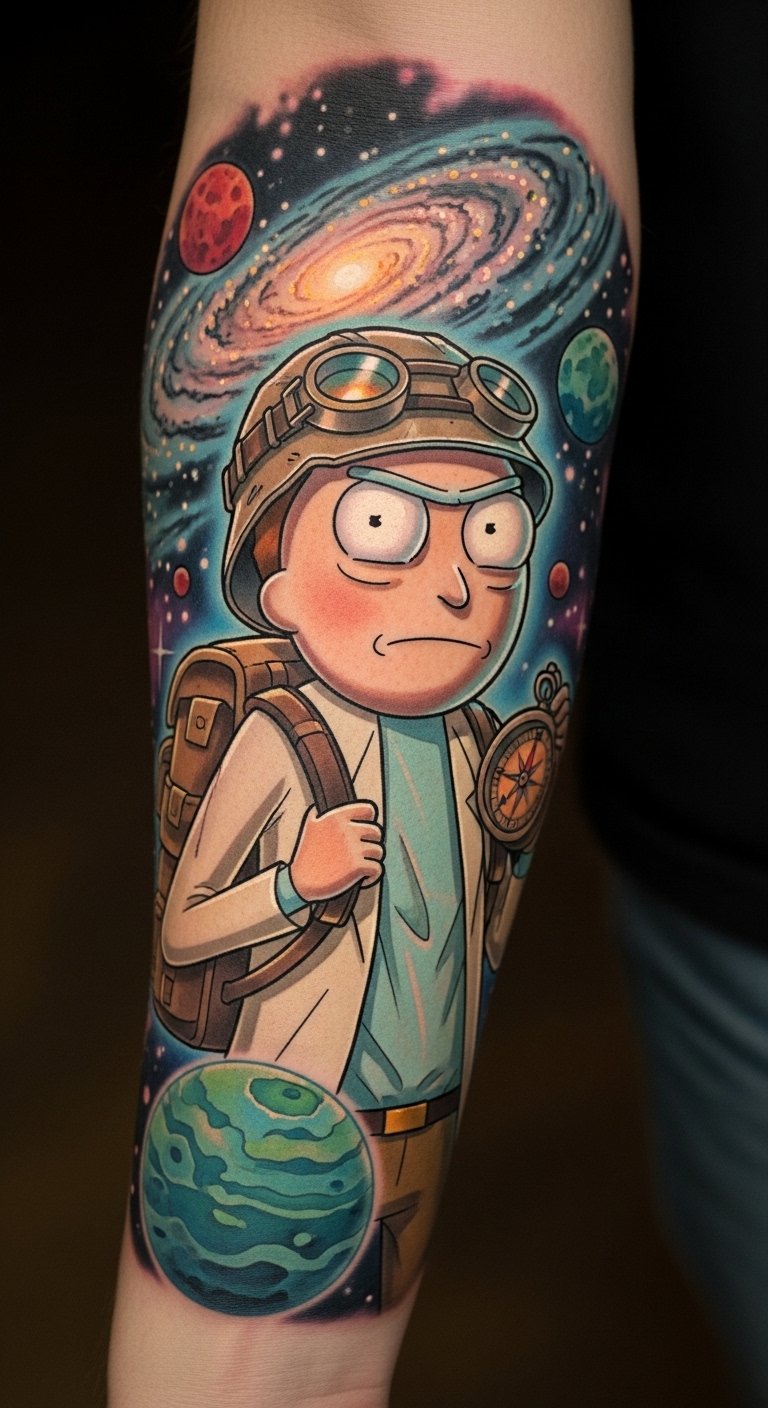 This tattoo design symbolizes the journey of exploration and personal evolution that mirrors the adventures of Rick and Morty.