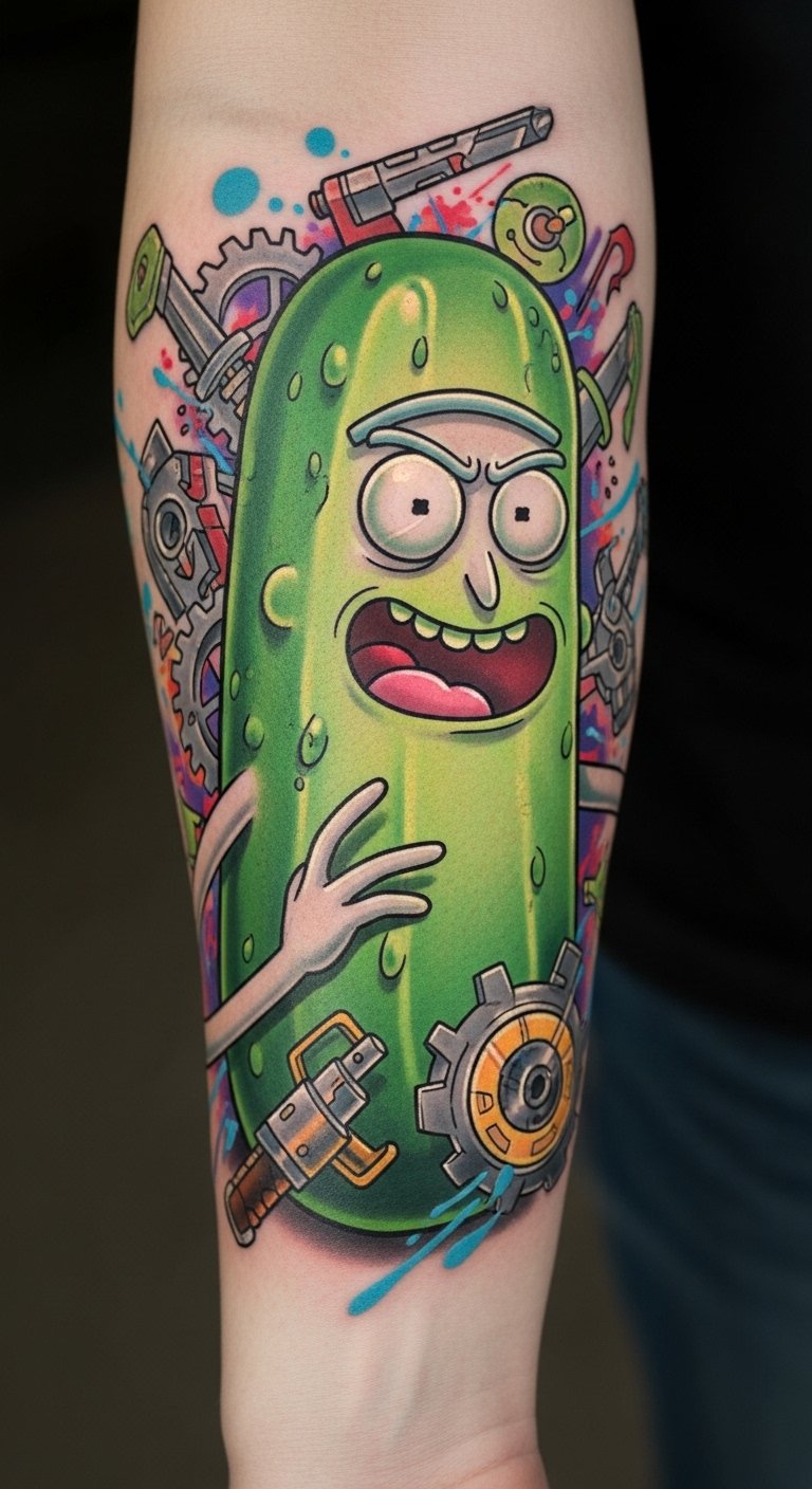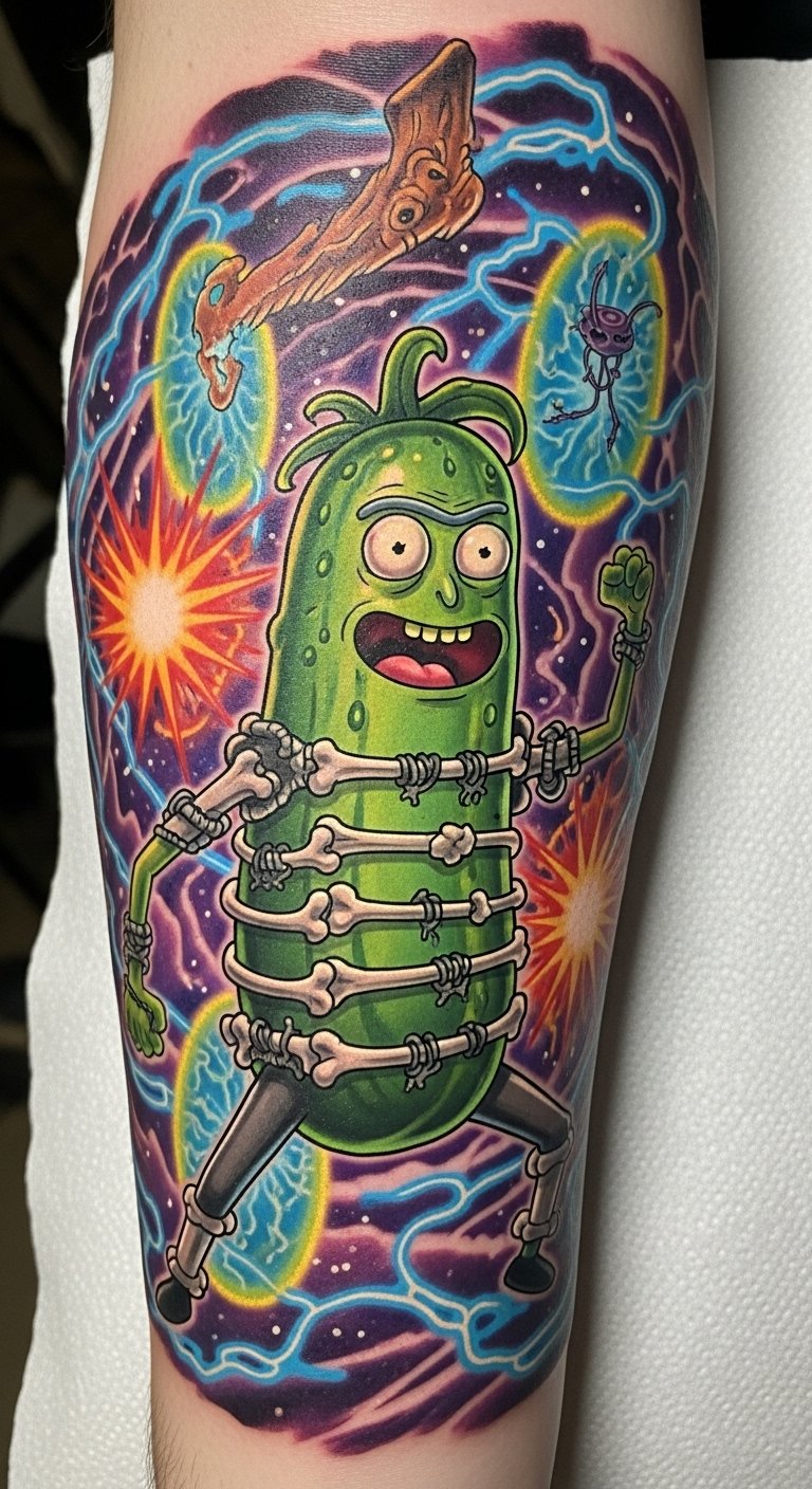 This tattoo captures the essence of Pickle Rick, representing transformation and resilience.