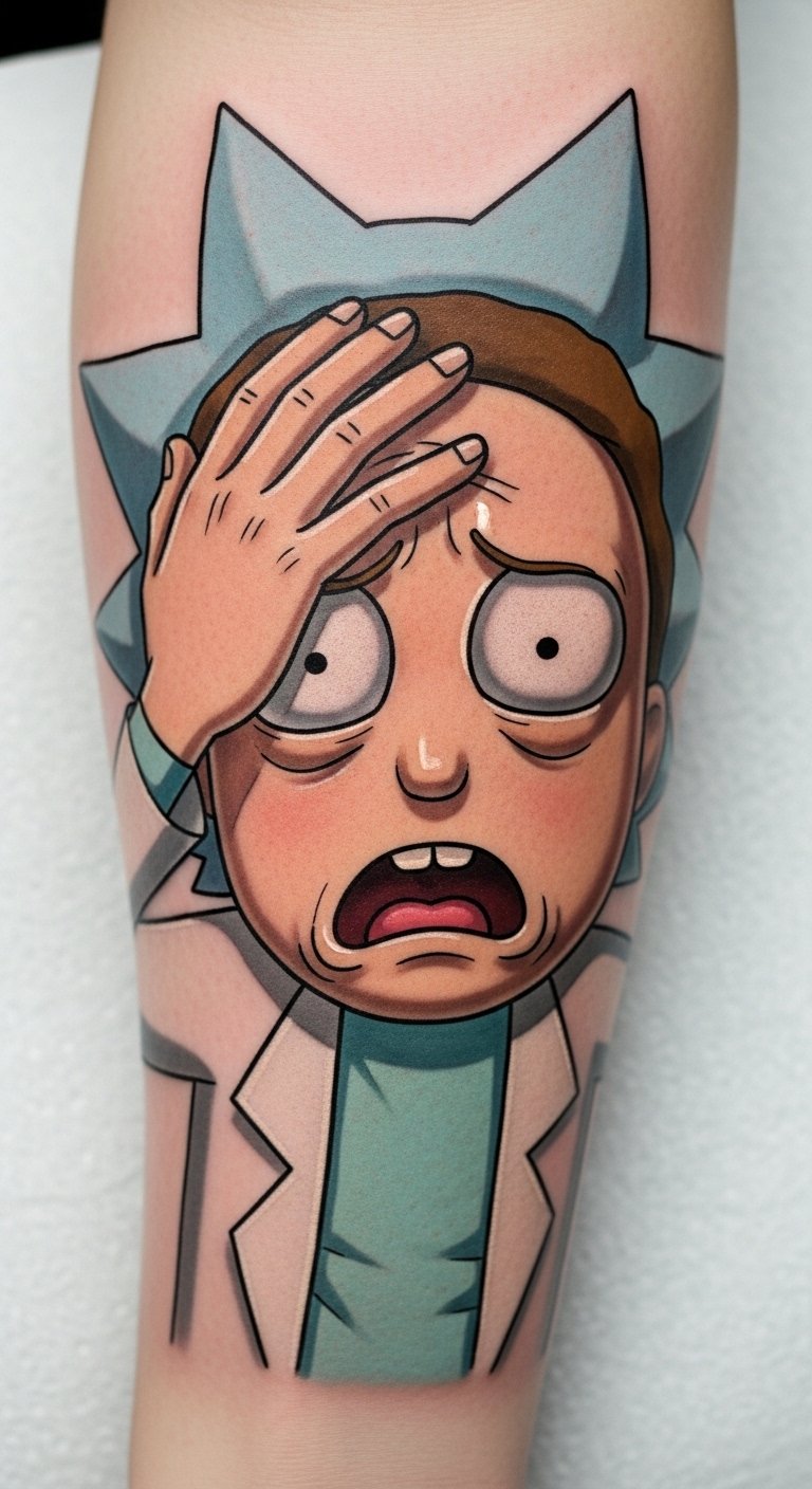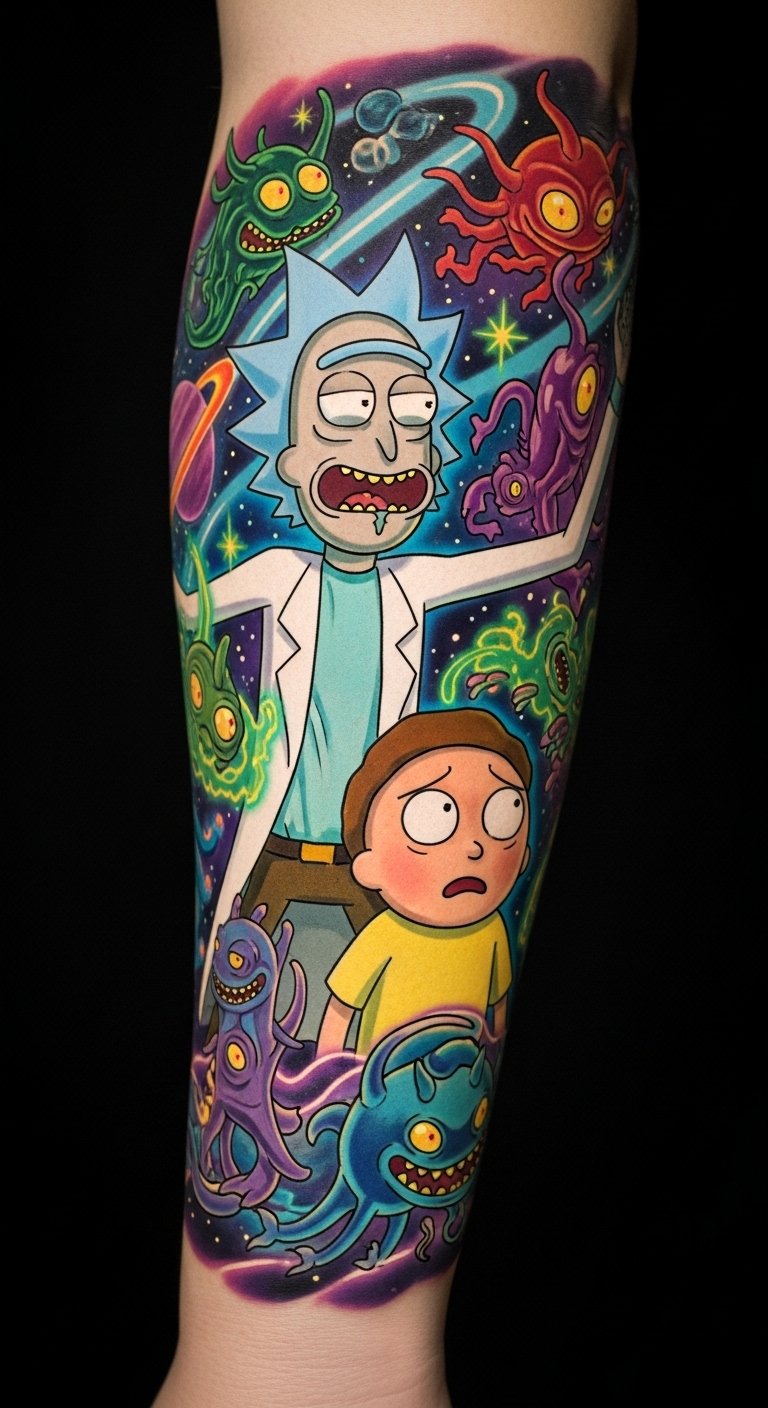 This tattoo represents a deep connection to the whimsical and unpredictable nature of the “Rick and Morty” universe.