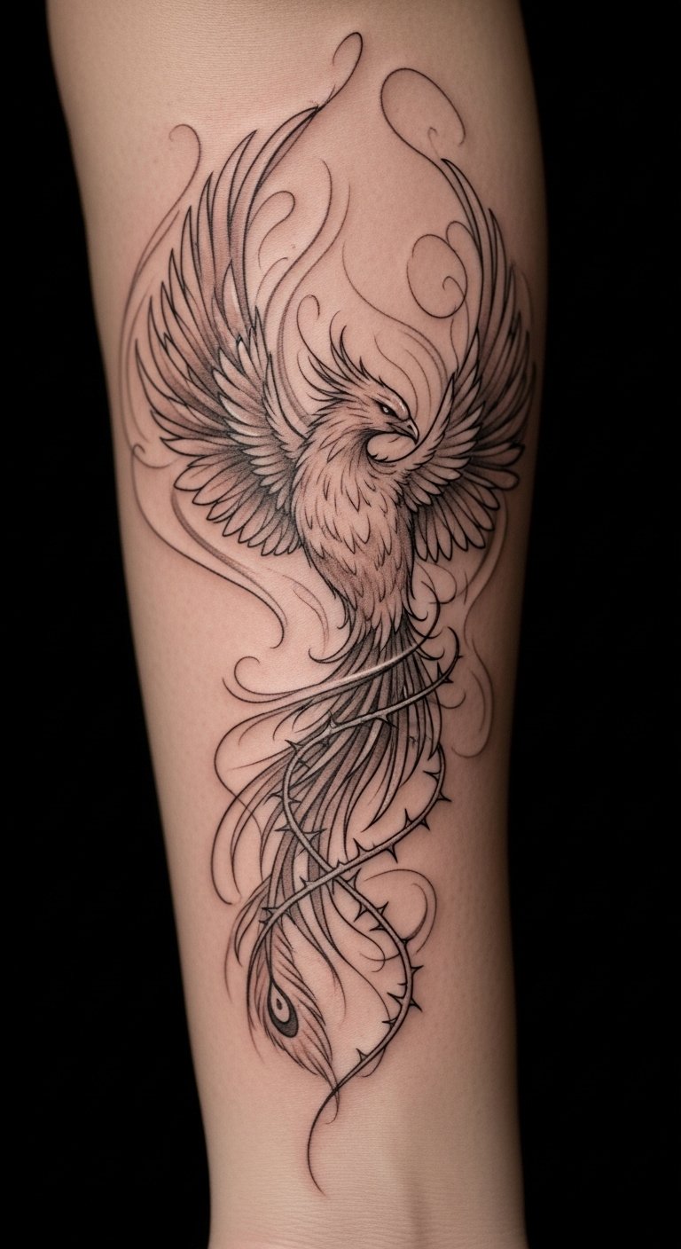 This tattoo design, placed on Morty’s forearm, serves as a constant reminder of his journey through life’s challenges. The phoenix represents rebirth and the ability to rise above adversity, while the thorns symbolize the struggles faced along the way.