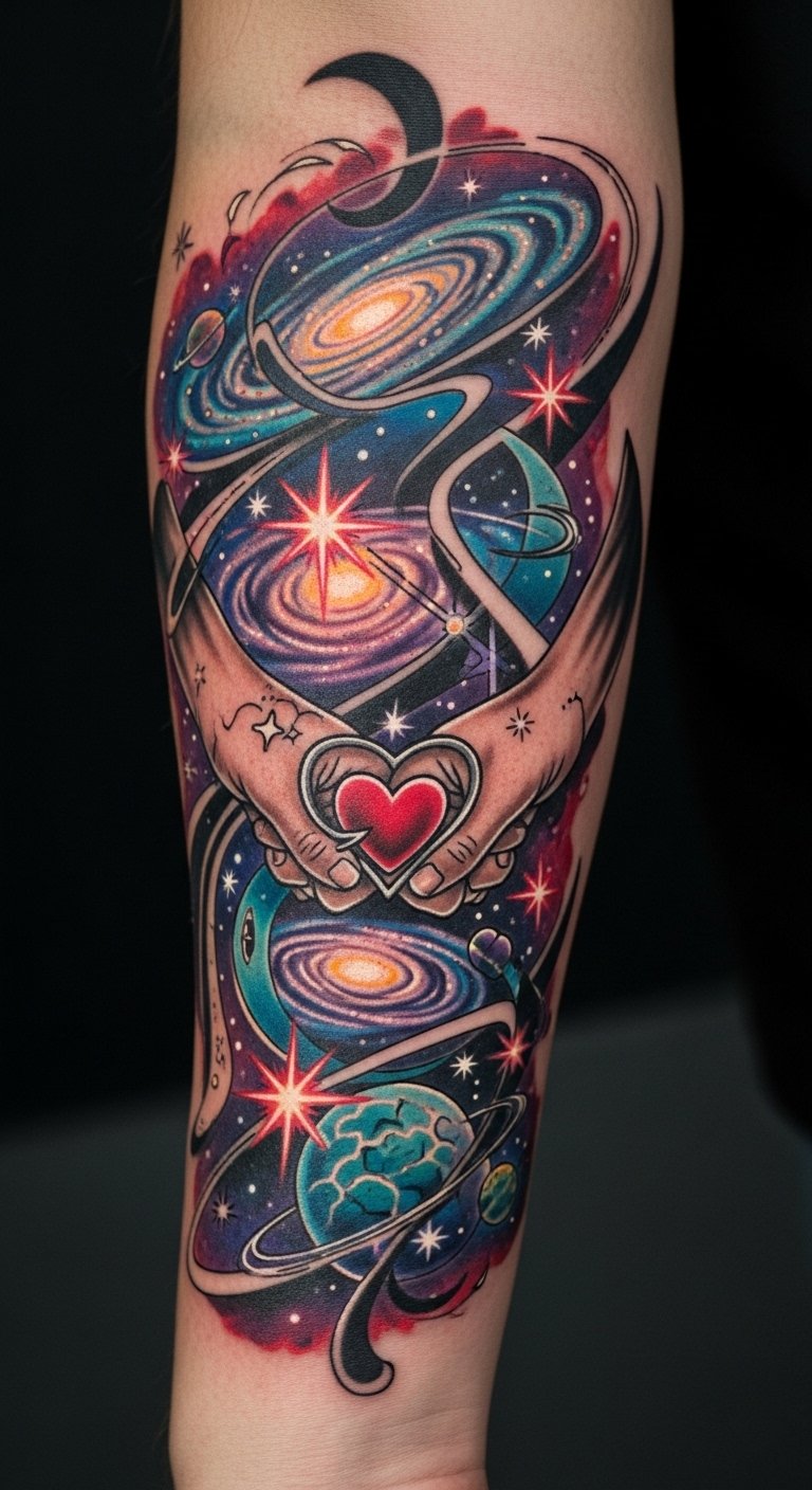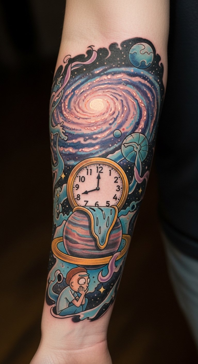 Positioned on the forearm, it serves as a constant reminder of the adventure and loyalty shared among family. The vibrant colors symbolize the humor and surrealism that permeate the series, while the cosmic elements evoke a sense of wonder and exploration.