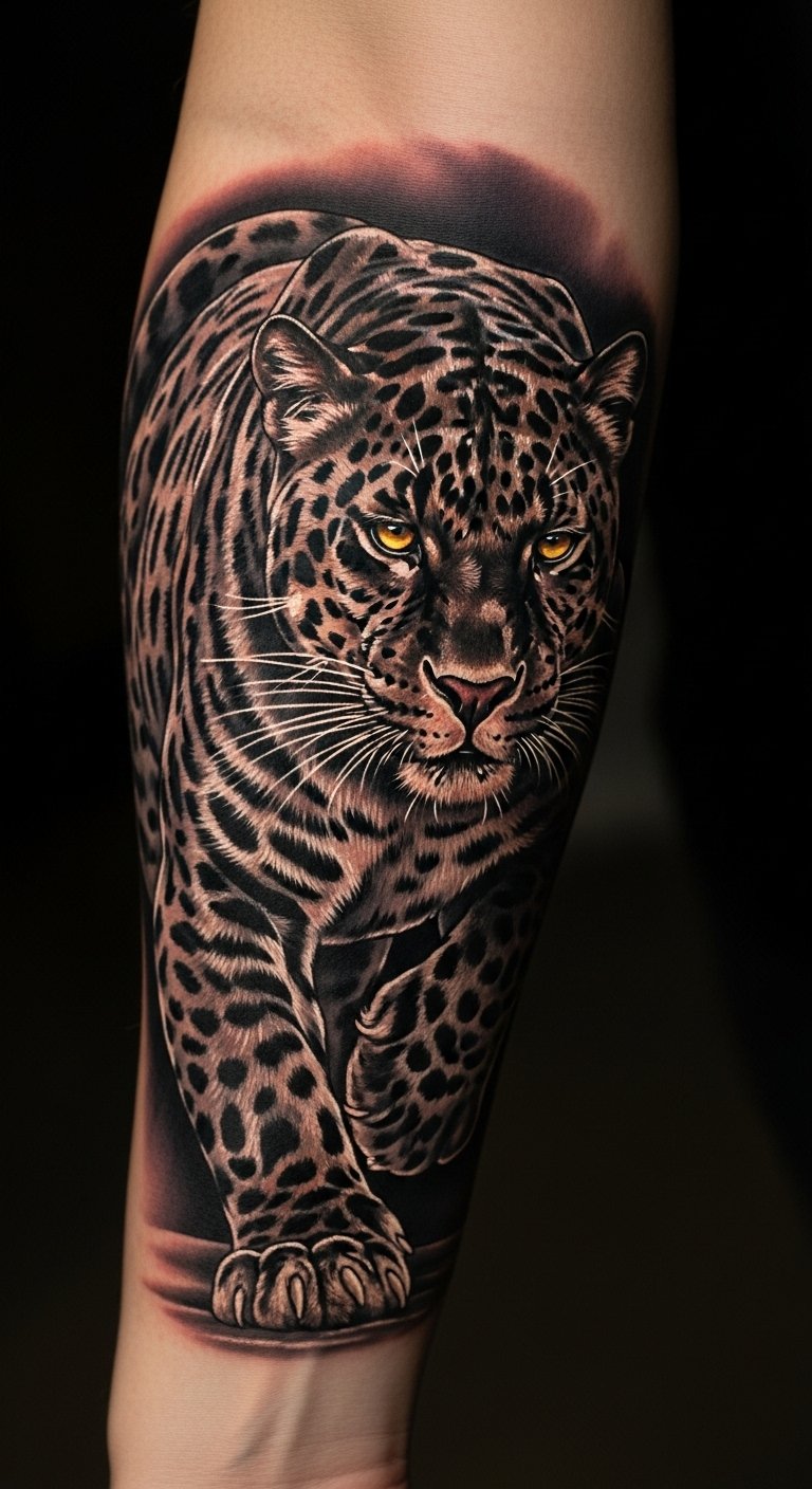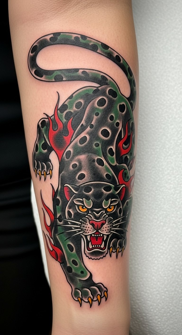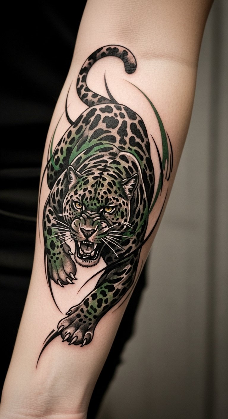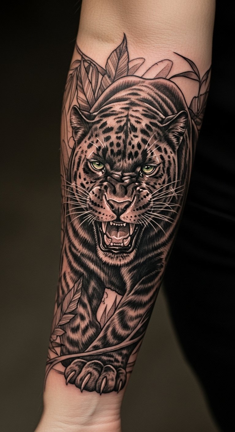 The panther tattoo on the forearm serves as a powerful emblem of resilience and emotional strength, reminding the wearer to rise above life’s challenges.