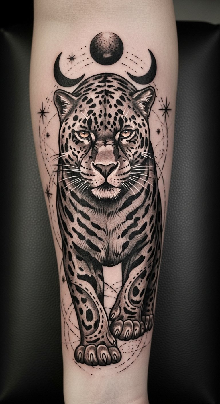 The panther tattoo embodies strength and resilience, serving as a personal spiritual guide. Positioned on the forearm, it’s easily visible, symbolizing protection and connection to cultural roots.