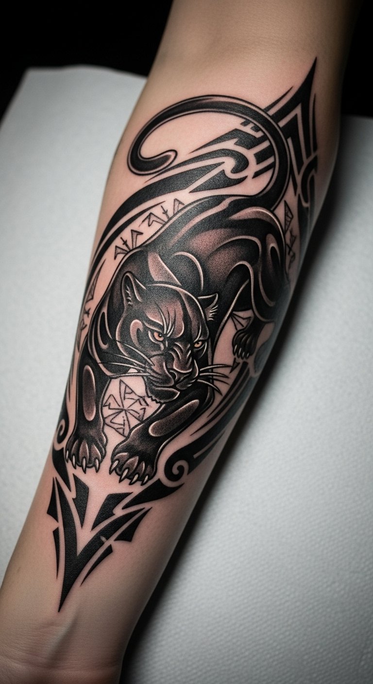 Positioned on the forearm, it becomes an intimate part of daily life, a reminder of inner power and confidence. The intricate tribal patterns surrounding the panther further emphasize cultural significance, creating a harmonious blend of beauty and meaning.