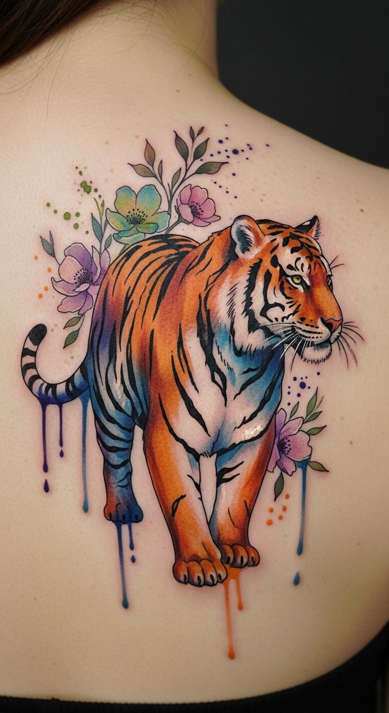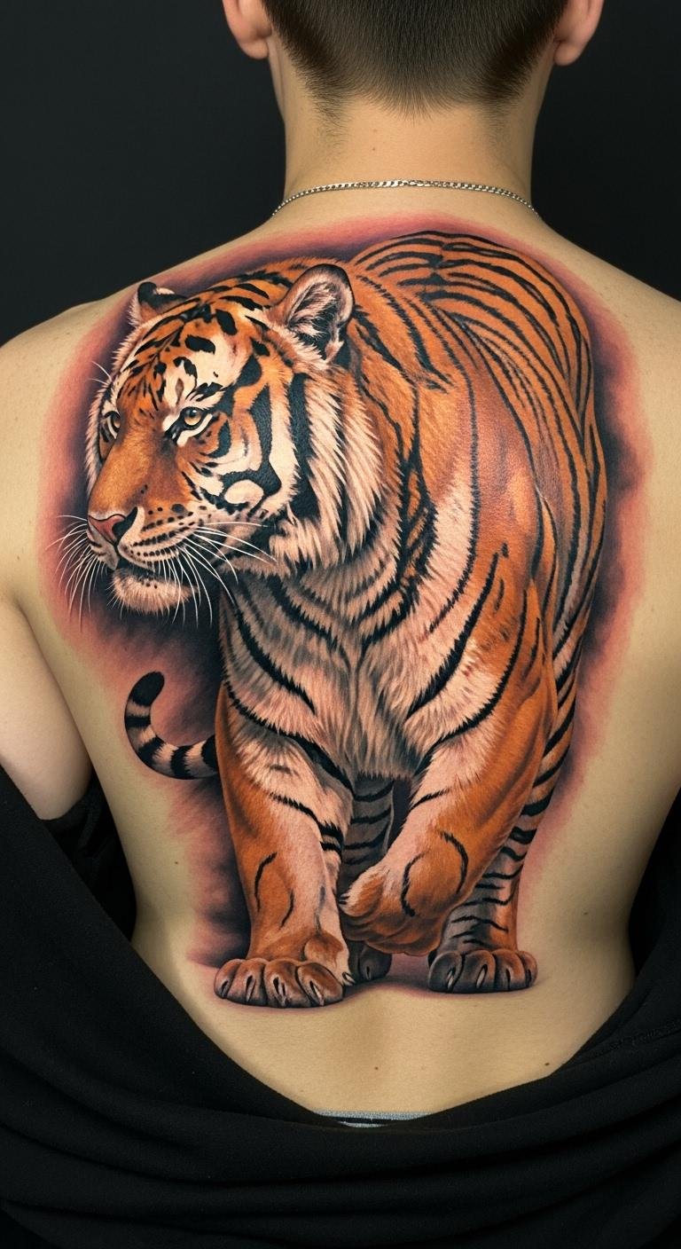 The upper back placement allows for a bold display of the tiger’s movement, symbolizing freedom and the adventurous spirit within.