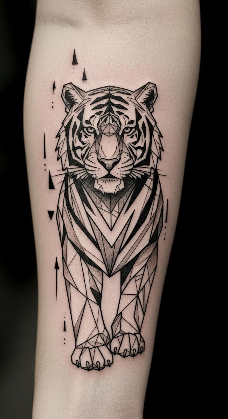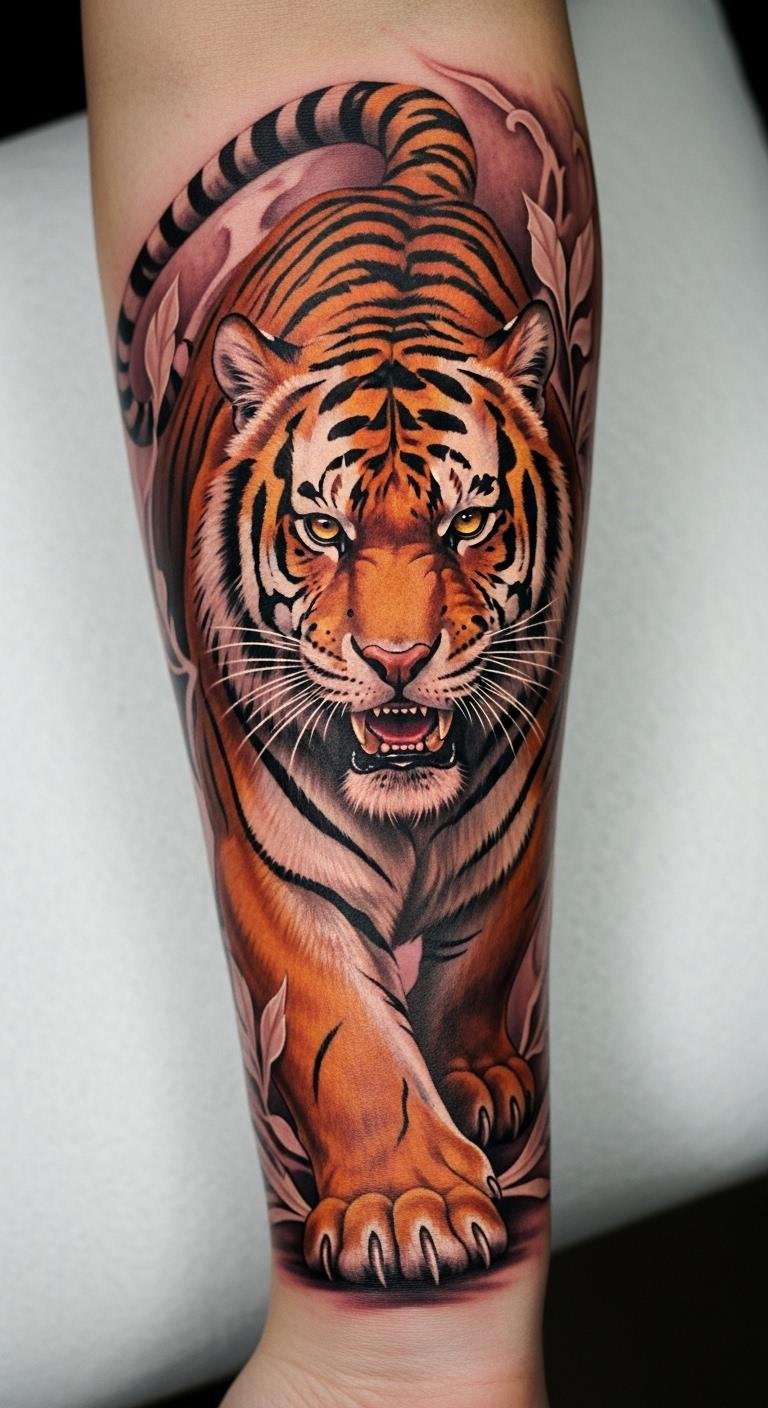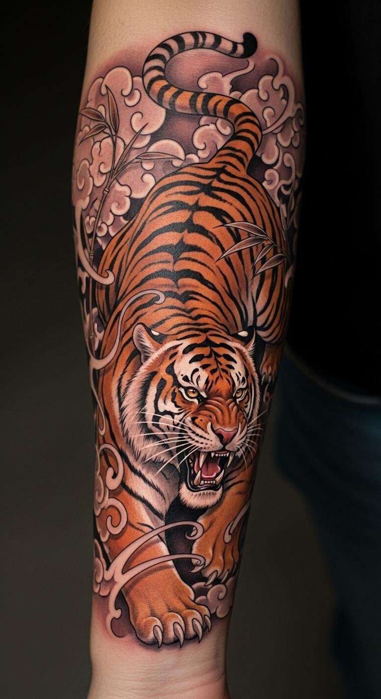 The protective tiger guardian tattoo on the forearm symbolizes fierce loyalty and the instinct to protect loved ones.