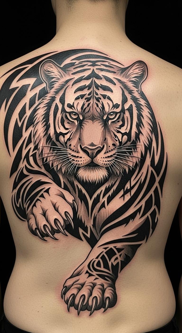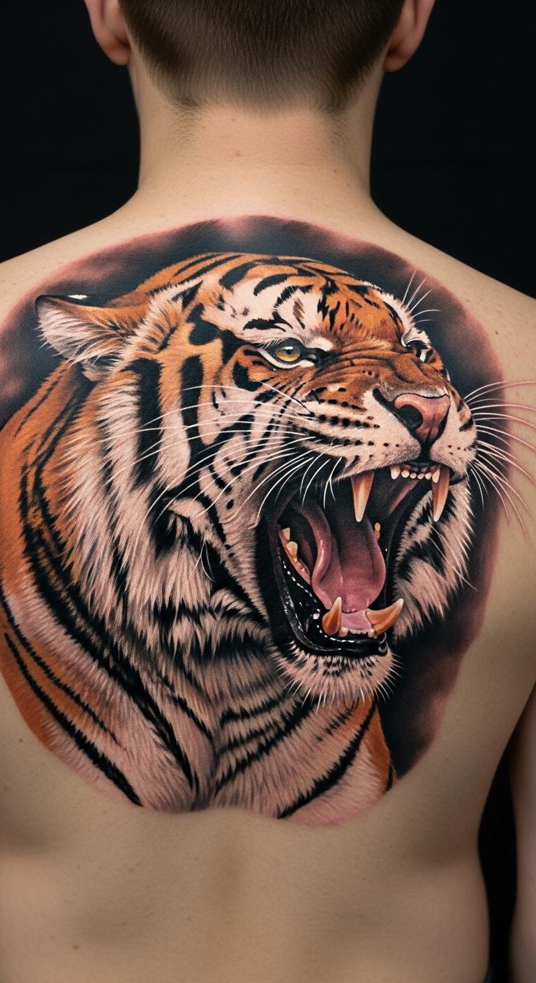 This majestic tiger tattoo serves as a powerful emblem of courage and independence, perfectly situated on the upper back to symbolize personal empowerment.