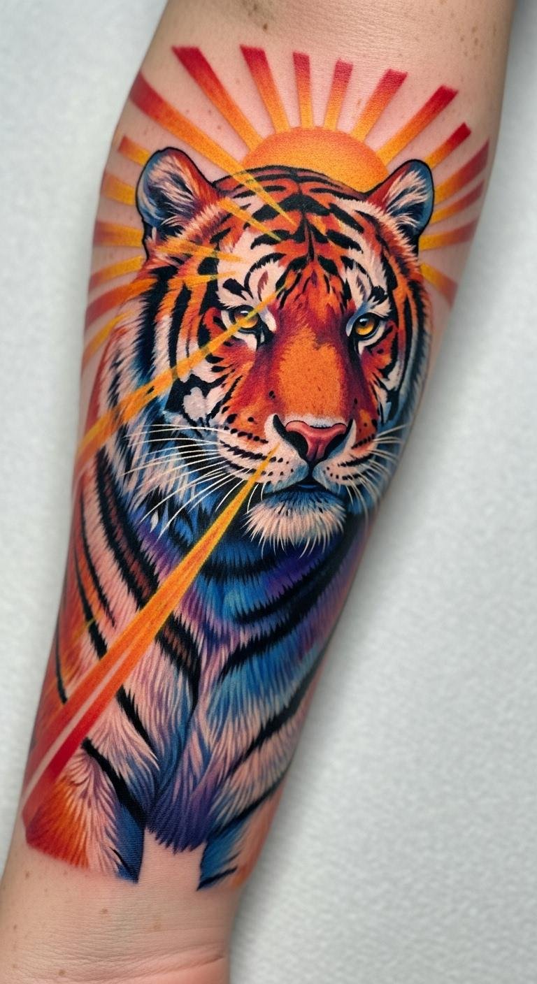This tattoo design embodies a powerful representation of strength and energy, with the colorful tiger symbolizing courage and fierceness.