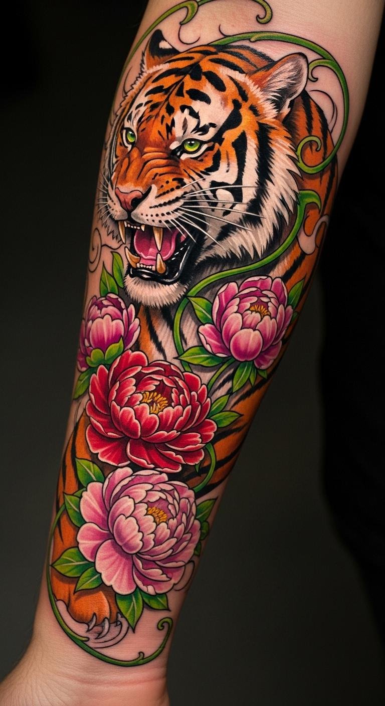 This tattoo symbolizes the balance of strength and beauty, showcasing courage through the tiger and prosperity through the peonies.