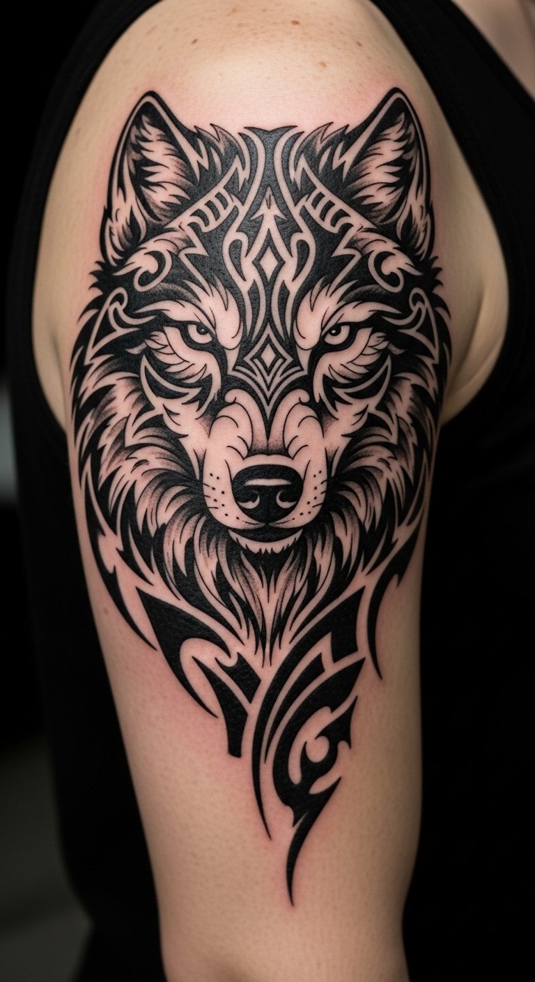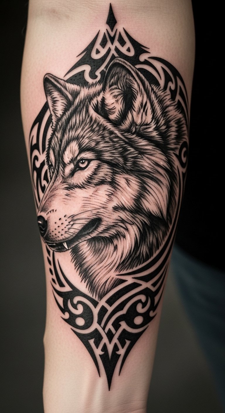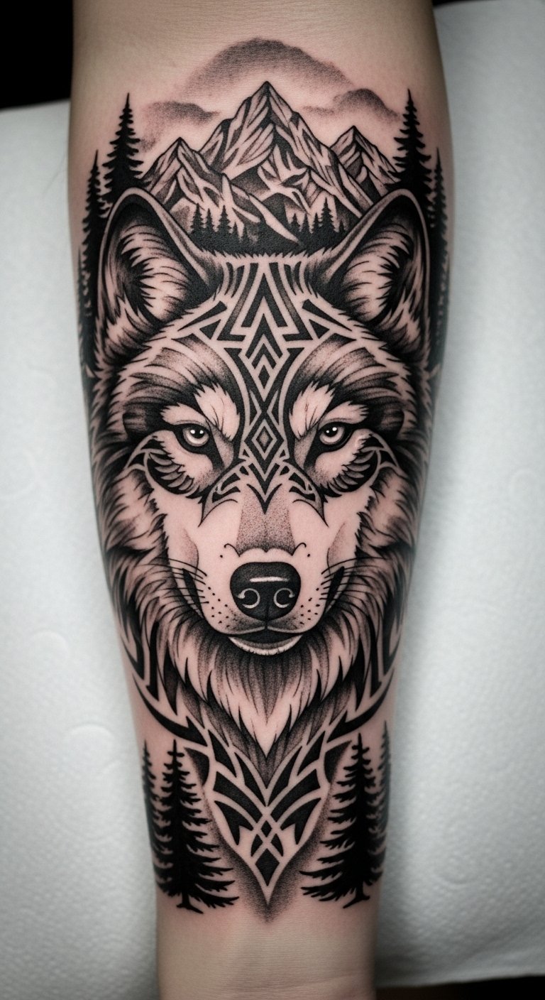 The tribal patterns evoke a deep connection to ancestry and nature, reflecting the spirit of the wolf as a guardian and guide.