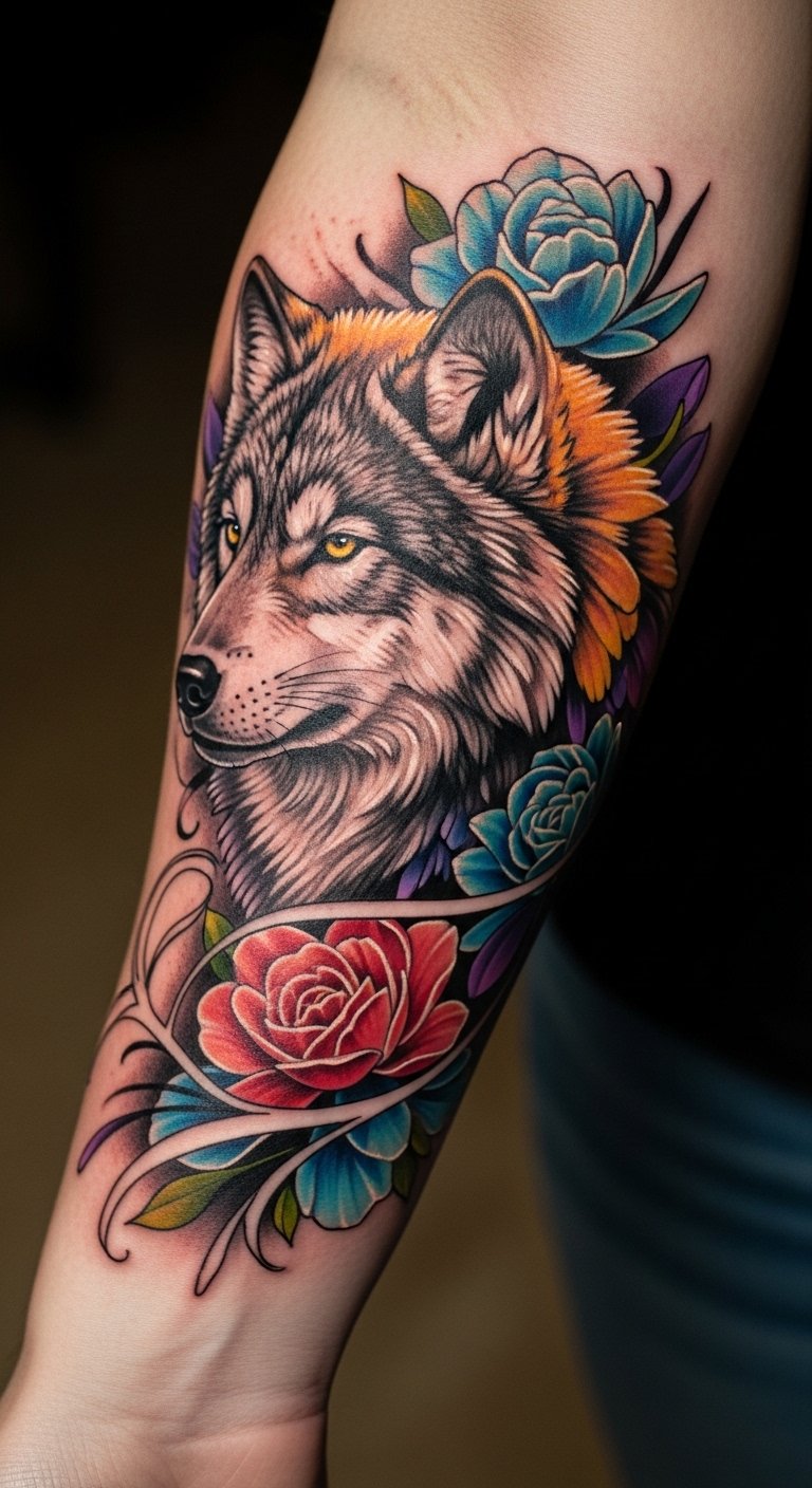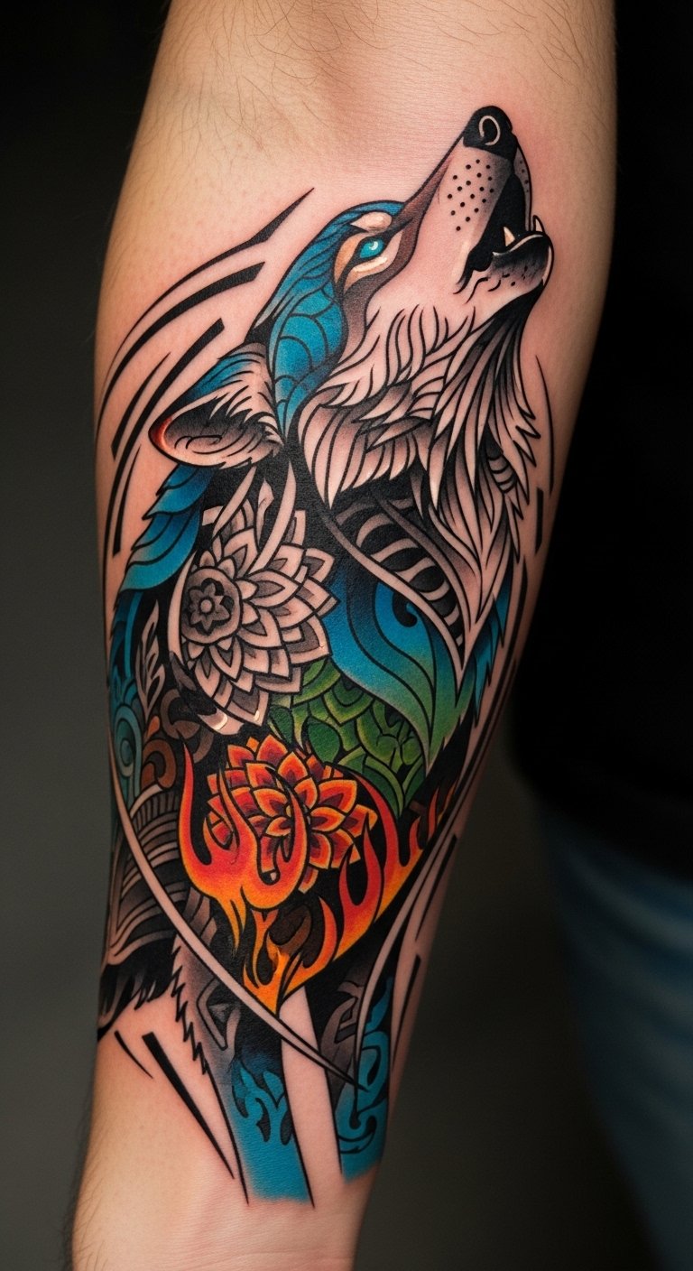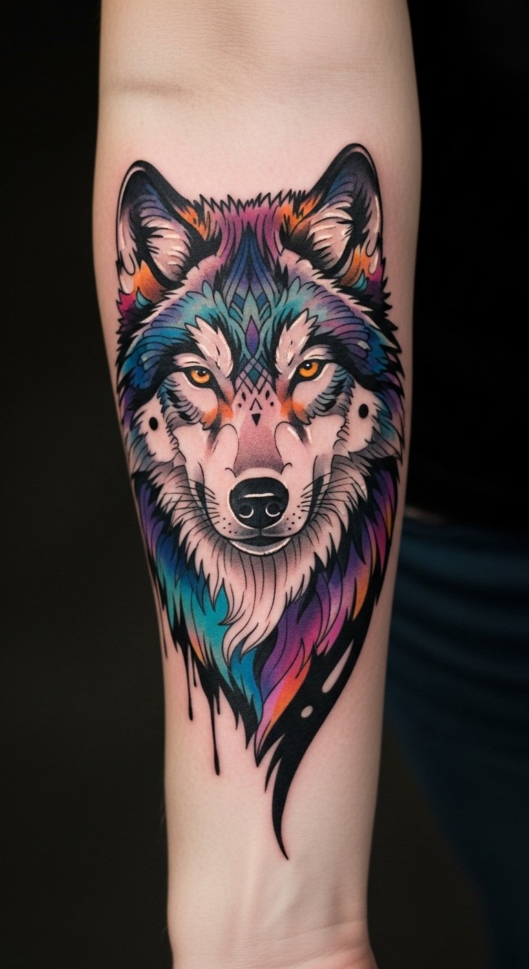 The vibrant colors symbolize passion and creativity, while the wolf itself is a powerful emblem of loyalty and instinct, making this tattoo a deeply personal and meaningful piece.