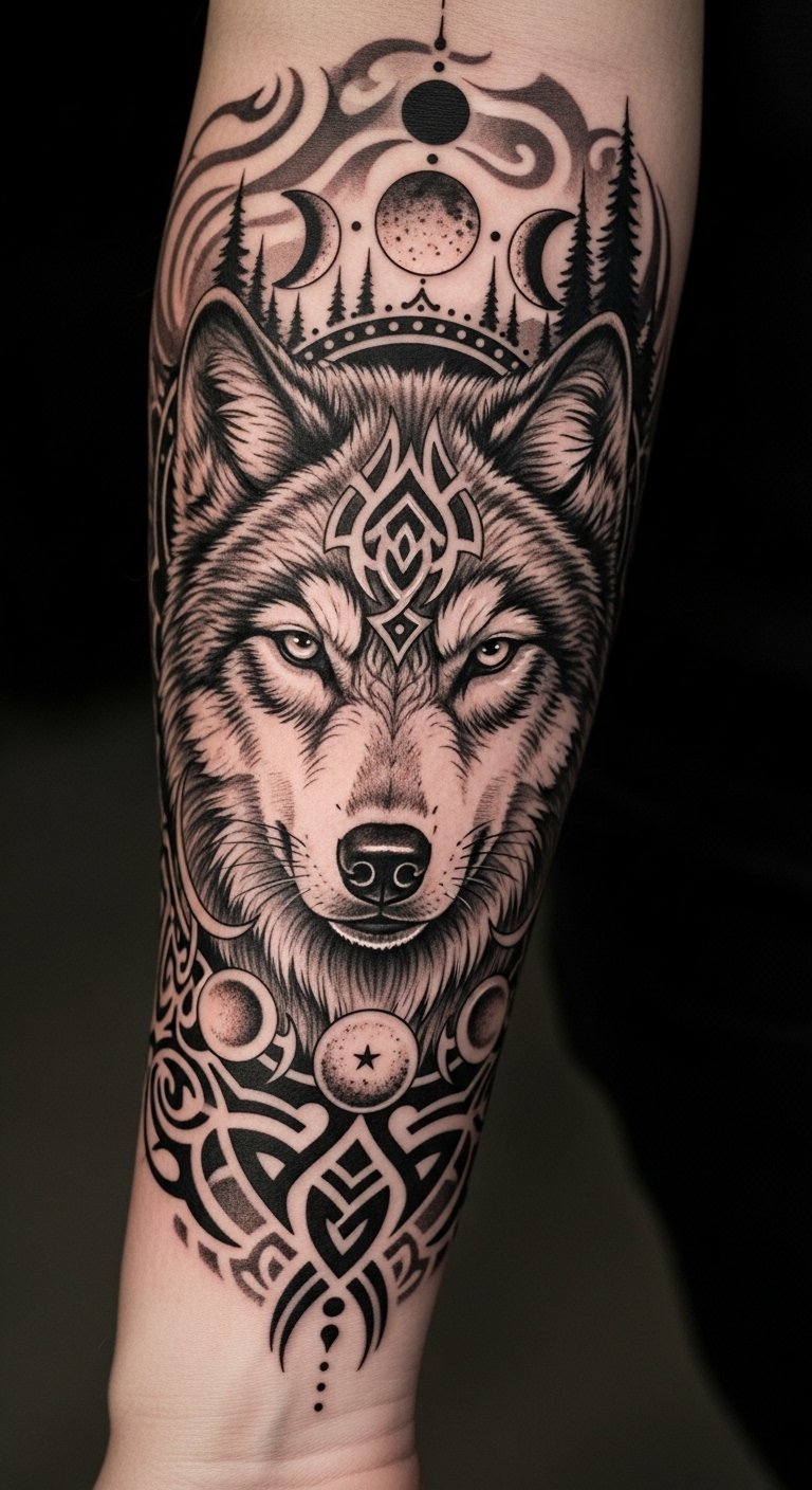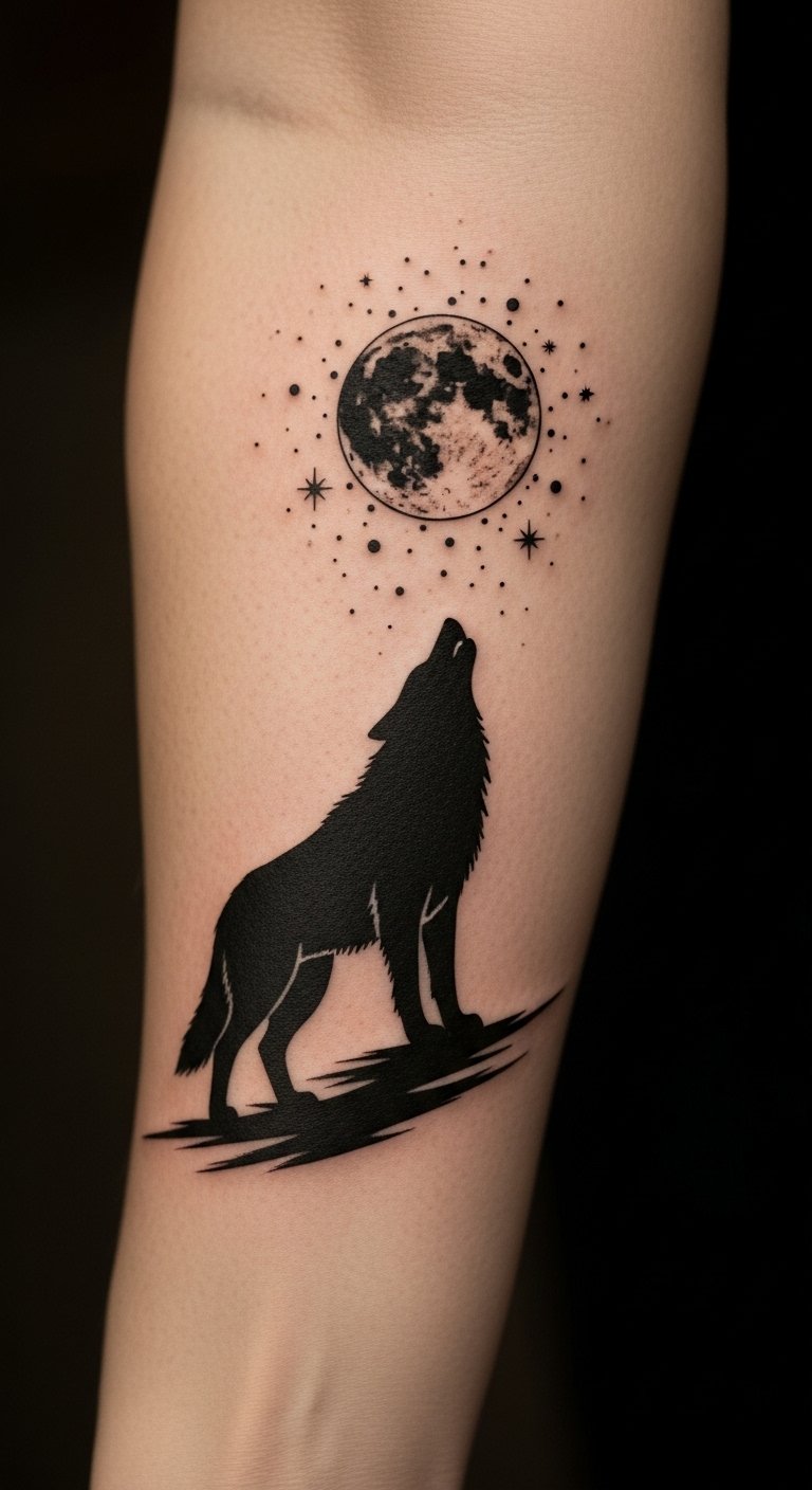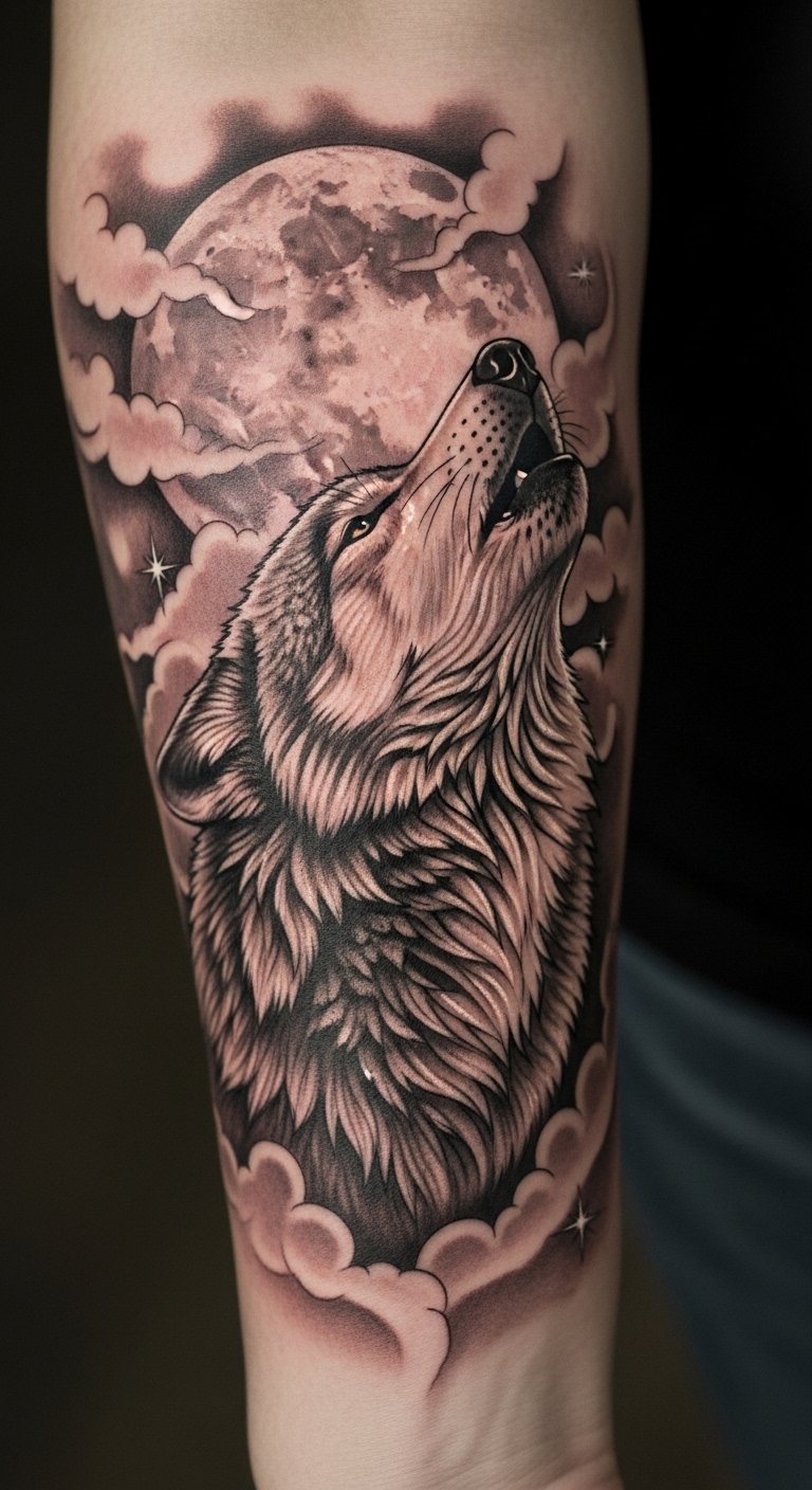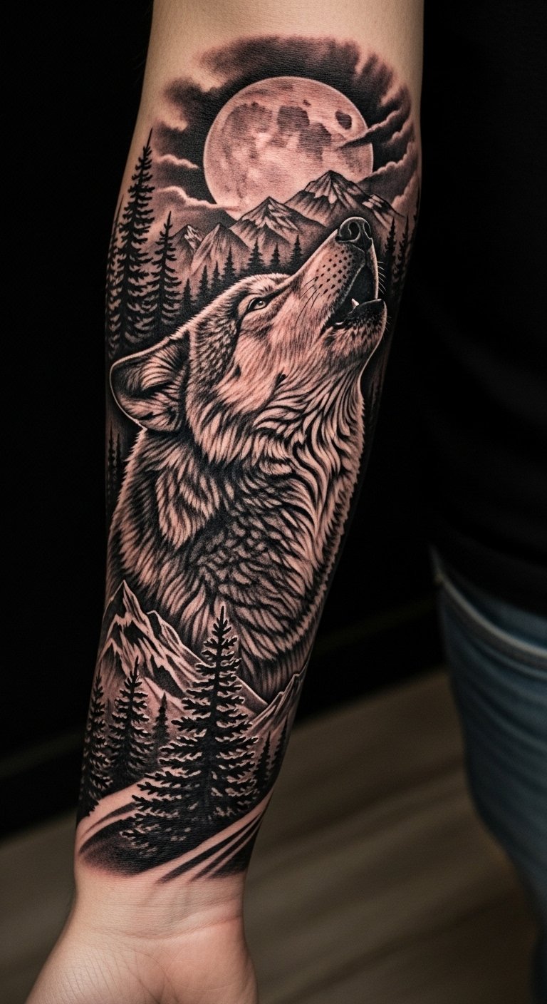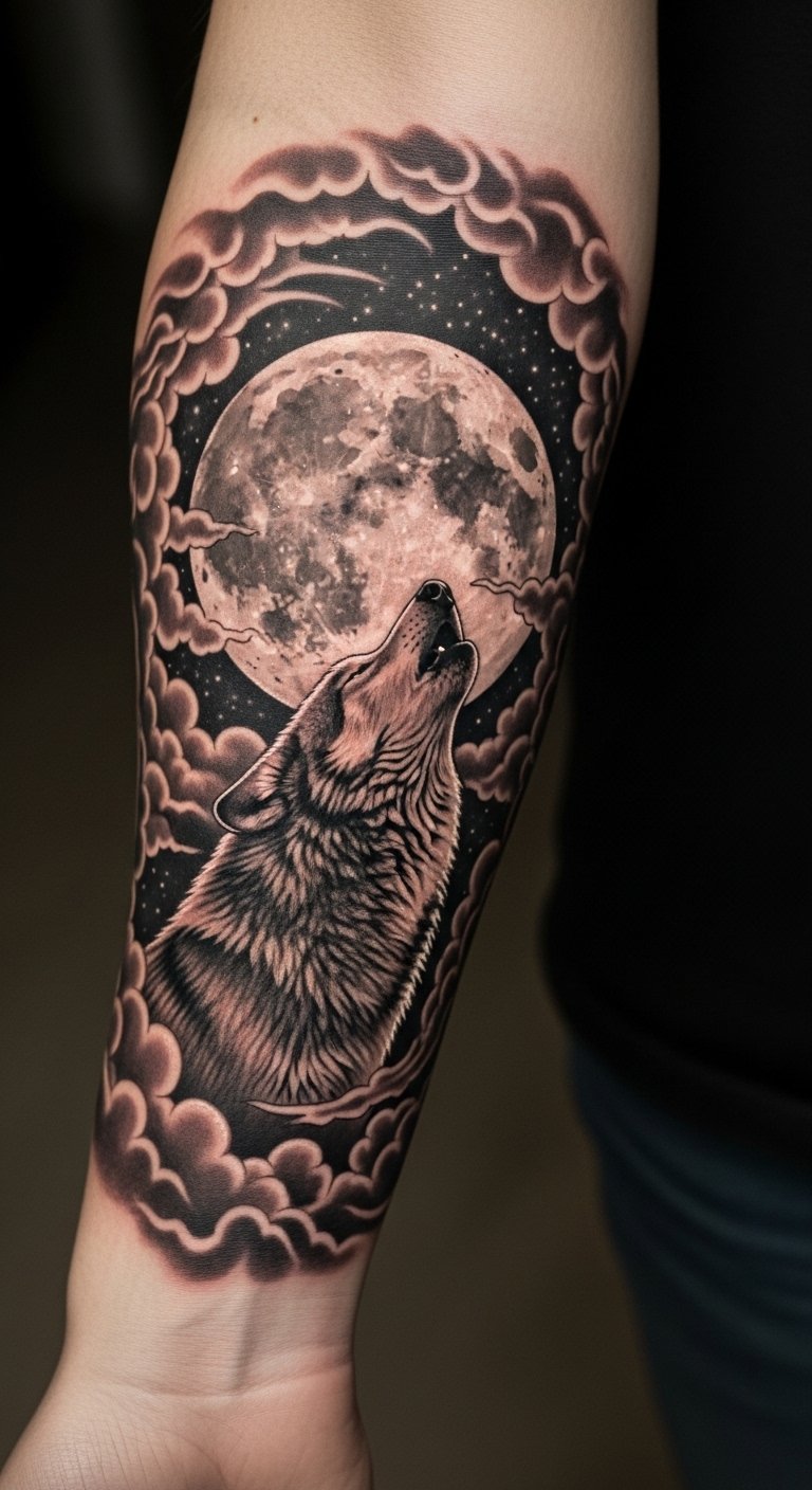 Positioned on the forearm, it serves as a constant reminder of personal strength and growth, reflecting the journey of self-reliance. The howling wolf represents the inner warrior, while the moon signifies freedom and guidance.