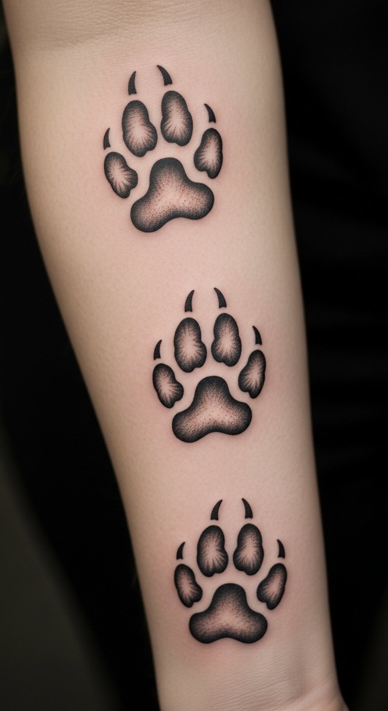 The placement of the wolf paw prints on the forearm symbolizes an individual’s journey through personal growth and emotional balance. This area is often visible and allows for a reminder of one’s intuitive journey, fostering a connection to ancestral wisdom.