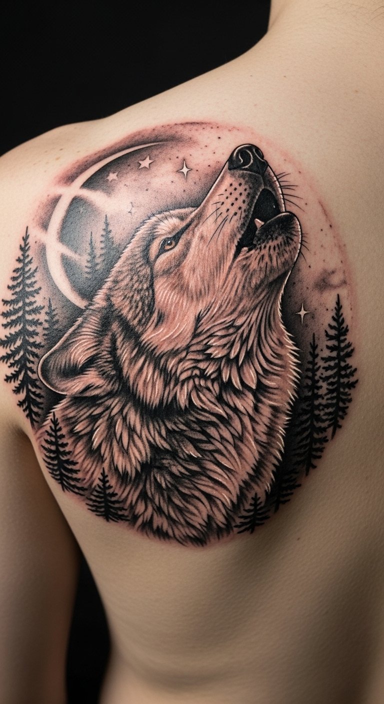 The howling wolf tattoo symbolizes a deep connection to the wild spirit within you, emphasizing themes of independence and spiritual liberation.