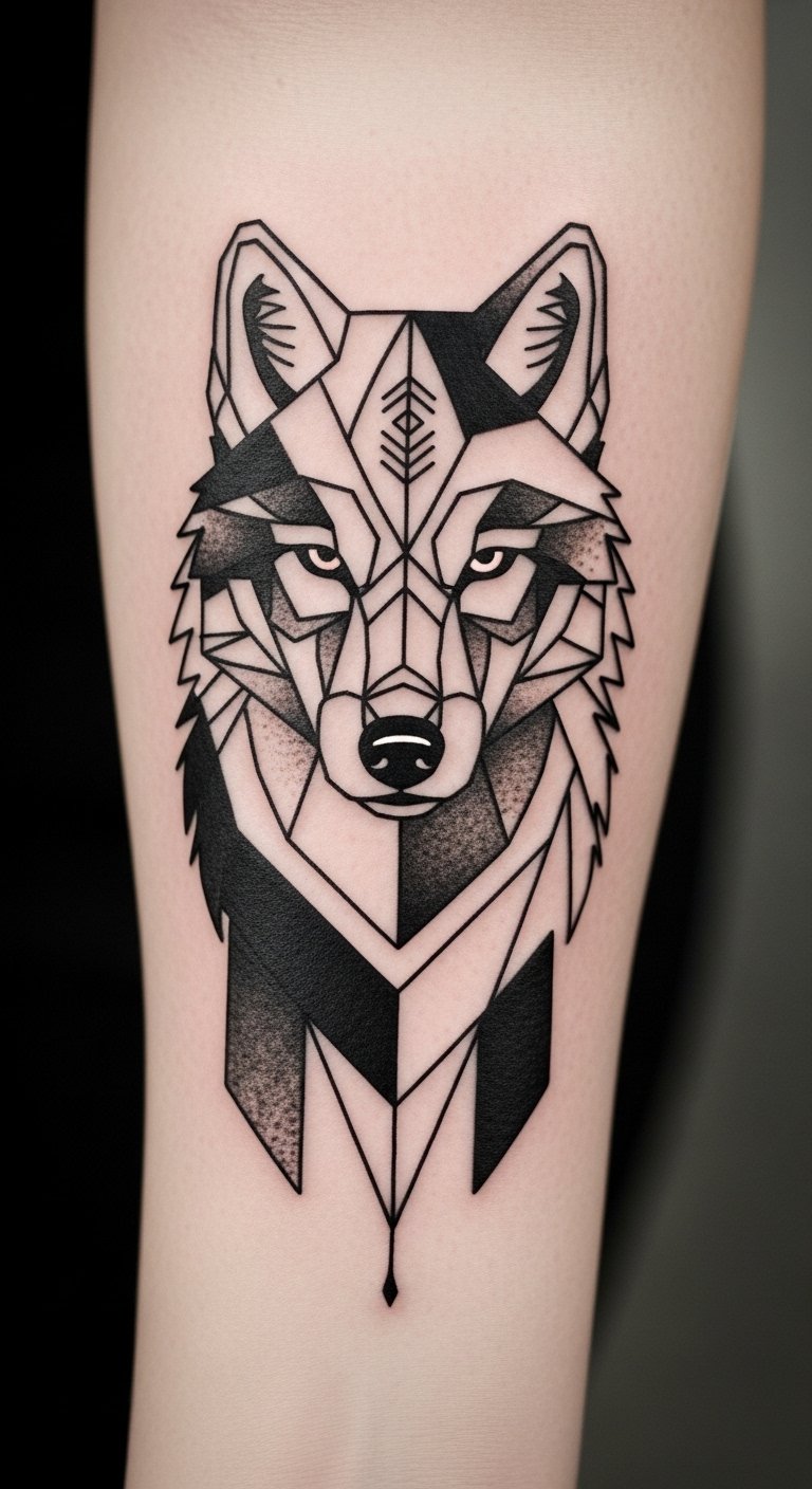 This tattoo serves as a powerful symbol of strength and resilience, reflecting the unique journey of the wearer. The abstract style breaks conventions, inviting viewers to appreciate the artistry while connecting with the deeper meanings of the wolf as a guardian of freedom and individuality.